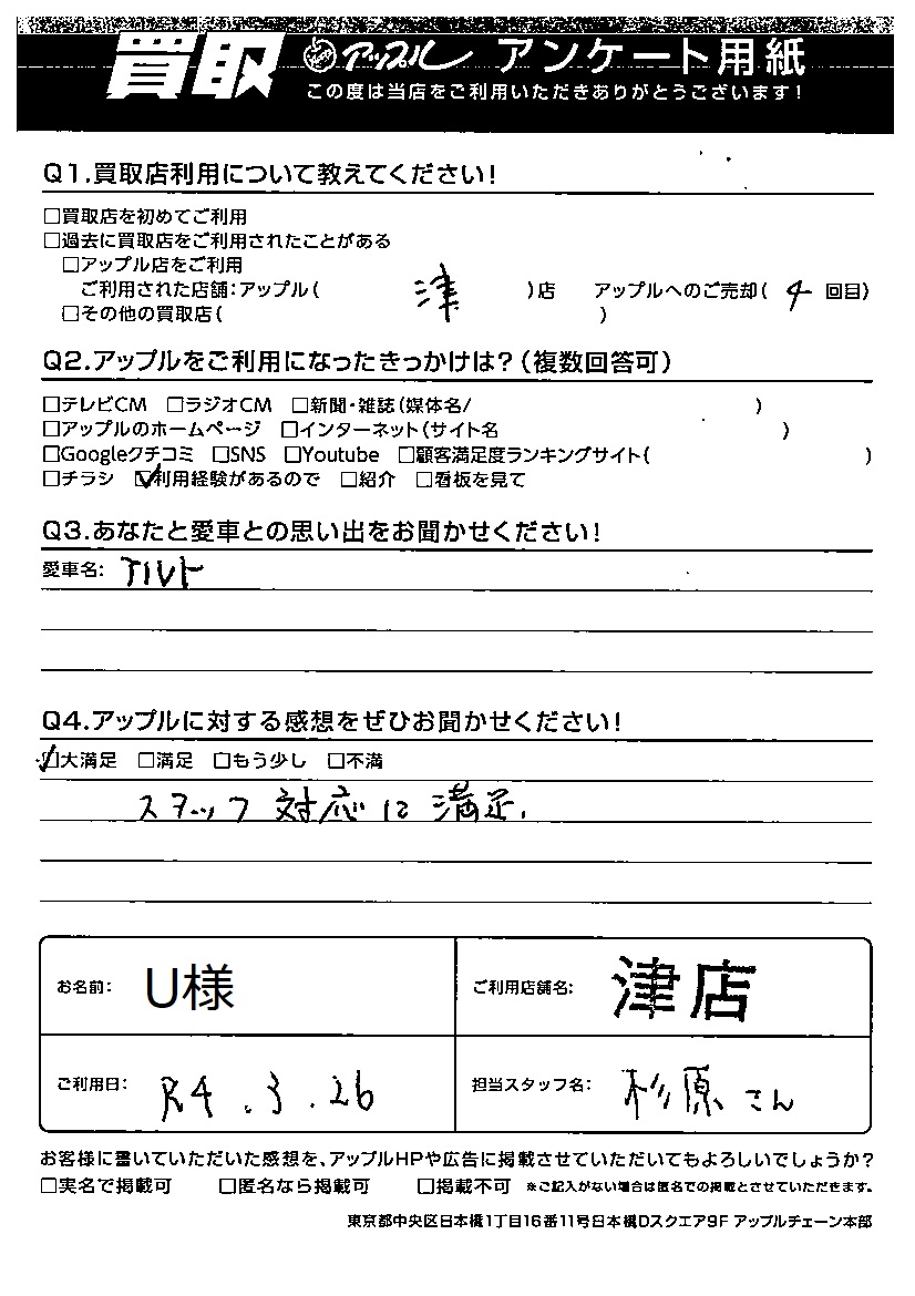 お車のご相談・ 査定だけでもOK! カンタン 入力 30秒 アップルがブランド買取始めました! お電話でも受付中! 受付時間10:00 ~ 19:00 059-223-7337 お車のご相談・ 査定だけでもOK! カンタン 入力 30秒 アップルがブランド買取始めました! お電話でも受付中! 受付時間10:00 ~ 19:00 059-223-7337 アップルがブランド買取始めました! お電話でも受付中! 受付時間10:00 ~ 19:00 059-223-7337 店舗情報 在庫車 スタッフ紹介 ブログ お客様の声 キャンペーン 無料査定 click お客様の声 ご記入日: 2022/03/26 U様 車名:スズキ アルト (2015年12月以降のワークス含む) Q アップルに対する感想をぜひお聞かせください!感想:大満足スタッフの対応に満足 前へ 次へ お客様の声一覧を見る