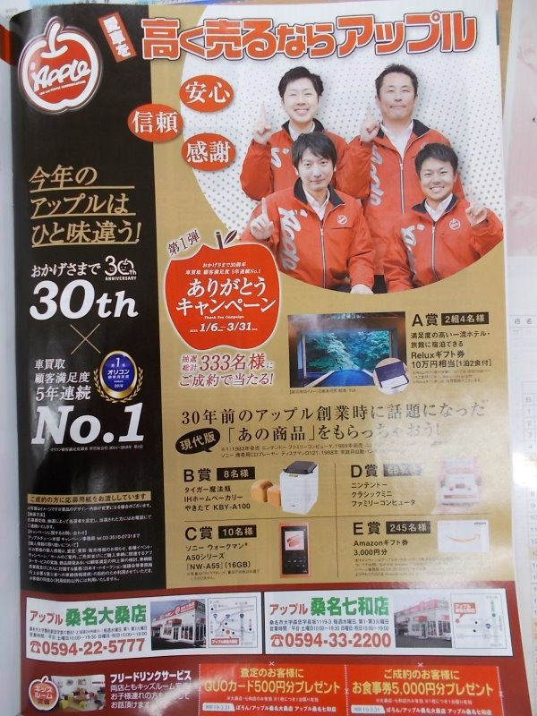 お車のご相談・ 査定だけでもOK! カンタン 入力 30秒 アップルがブランド買取始めました! お電話でも受付中! 受付時間10:00 ~ 19:00 0594-33-2200 お車のご相談・ 査定だけでもOK! カンタン 入力 30秒 アップルがブランド買取始めました! お電話でも受付中! 受付時間10:00 ~ 19:00 0594-33-2200 アップルがブランド買取始めました! お電話でも受付中! 受付時間10:00 ~ 19:00 0594-33-2200 店舗情報 在庫車 スタッフ紹介 ブログ お客様の声 キャンペーン 無料査定 click [ 未分類 ] 2019/03/04 (月) 17:09 ☆お知らせ☆ 皆様こんにちは!!店長の太田です☆本日はお知らせがございます!!ポロン3月号にアップル桑名七和店が載っております♪♪ポロン持参で査定のお客様にクオカード500円分プレゼント☆☆さらにご成約のお客様に、お食事券5000円分プレゼント☆☆是非この機会にアップル桑名七和店にお越しください♪♪お客様のご来店心よりお待ちしております(^o^)明日、明後日は定休日になります!!ご迷惑お掛け致しますがよろしくお願い致します!! 2019-03-04 17:09:45 新しい記事へ 古い記事へ 最新記事 お知らせ★ポップアップストア♪♪キャンペーン最終日♪♪☆残り僅か☆☆祝27周年☆ 店舗情報に戻る 月別アーカイブ 2026年04月(2)2026年03月(2)2026年02月(2)2026年01月(3)2025年12月(5)2025年11月(4)2025年10月(3)2025年09月(6)2025年08月(6)2025年07月(7)2025年06月(21)2025年05月(20)2025年04月(6)2025年03月(1)2025年02月(5)2025年01月(4)2024年12月(6)2024年11月(3)2024年10月(5)2024年09月(4)2024年08月(5)2024年07月(8)2024年06月(3)2024年05月(4)2024年04月(5)2024年03月(3)2024年02月(4)2024年01月(4)2023年12月(5)2023年11月(5)2023年10月(3)2023年09月(9)2023年08月(7)2023年07月(5)2023年06月(4)2023年05月(2)2023年04月(3)2023年03月(1)2023年02月(1)2023年01月(2)2022年12月(4)2022年11月(1)2022年10月(3)2022年09月(8)2022年08月(4)2022年07月(4)2022年06月(3)2022年05月(3)2022年04月(6)2022年03月(2)2022年02月(3)2022年01月(5)2021年12月(6)2021年11月(5)2021年10月(6)2021年09月(7)2021年08月(8)2021年07月(6)2021年06月(5)2021年05月(3)2021年04月(4)2021年03月(4)2021年02月(8)2021年01月(6)2020年12月(4)2020年11月(3)2020年10月(4)2020年09月(6)2020年08月(6)2020年07月(7)2020年06月(7)2020年05月(5)2020年04月(8)2020年03月(5)2020年02月(10)2020年01月(6)2019年12月(8)2019年11月(6)2019年10月(8)2019年09月(6)2019年08月(7)2019年07月(5)2019年06月(4)2019年05月(4)2019年04月(4)2019年03月(3)2019年02月(3)2018年12月(3)2018年11月(3)2018年10月(5)2018年09月(6)2018年08月(5)2018年07月(5)2018年06月(4)2018年05月(4)2018年04月(7)2018年03月(5)2018年02月(3)2018年01月(4)2017年12月(5)2017年11月(4)2017年10月(4)2017年09月(3)2017年08月(4)2017年07月(4)2017年06月(2)2017年05月(4)2017年04月(4)2017年03月(2)2017年02月(2)2017年01月(3)2016年12月(3)2016年11月(2)2016年10月(3)2016年09月(4)2016年08月(9)2016年07月(2)2016年06月(4)2016年05月(2)2016年04月(4)2016年02月(2)2016年01月(3)2015年12月(2)2015年10月(1)2015年09月(1)2015年08月(3)2015年07月(3)2015年06月(2)2015年05月(2)2015年04月(3)2015年03月(1)2015年02月(1)2015年01月(3)2014年12月(3)2014年11月(2)2014年10月(2)2014年09月(5)2014年08月(3)2014年07月(3)2014年06月(3)2014年05月(6)2014年04月(2)2014年01月(2)2013年12月(1)2013年11月(2)2013年09月(1)