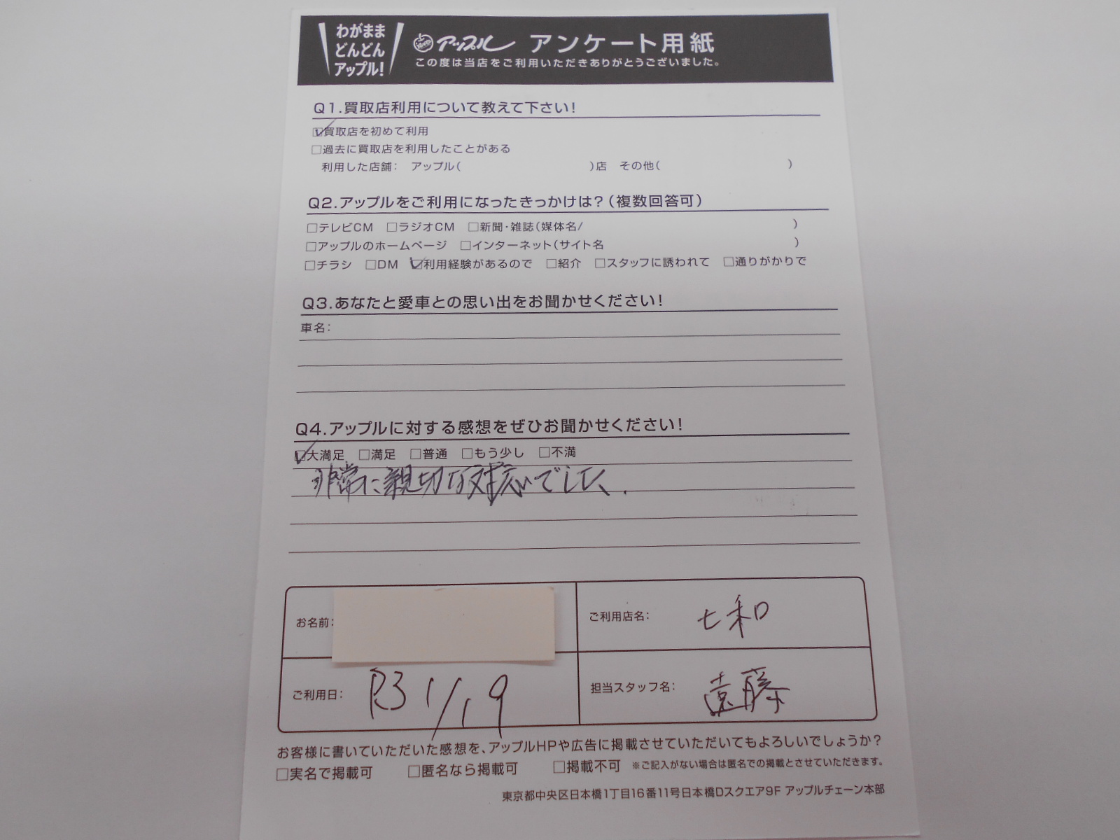お車のご相談・ 査定だけでもOK! カンタン 入力 30秒 アップルがブランド買取始めました! お電話でも受付中! 受付時間10:00 ~ 19:00 0594-33-2200 お車のご相談・ 査定だけでもOK! カンタン 入力 30秒 アップルがブランド買取始めました! お電話でも受付中! 受付時間10:00 ~ 19:00 0594-33-2200 アップルがブランド買取始めました! お電話でも受付中! 受付時間10:00 ~ 19:00 0594-33-2200 店舗情報 在庫車 スタッフ紹介 ブログ お客様の声 キャンペーン 無料査定 click お客様の声 ご記入日: 2021/01/19 匿名希望ヴィッツ様 非常に親切な対応でした。 前へ 次へ お客様の声一覧を見る