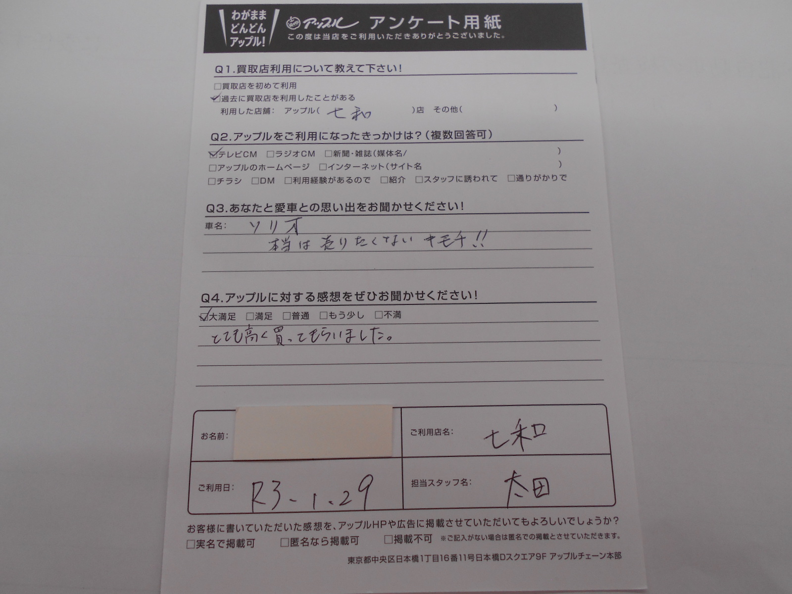 お車のご相談・ 査定だけでもOK! カンタン 入力 30秒 アップルがブランド買取始めました! お電話でも受付中! 受付時間10:00 ~ 19:00 0594-33-2200 お車のご相談・ 査定だけでもOK! カンタン 入力 30秒 アップルがブランド買取始めました! お電話でも受付中! 受付時間10:00 ~ 19:00 0594-33-2200 アップルがブランド買取始めました! お電話でも受付中! 受付時間10:00 ~ 19:00 0594-33-2200 店舗情報 在庫車 スタッフ紹介 ブログ お客様の声 キャンペーン 無料査定 click お客様の声 ご記入日: 2021/01/29 匿名希望ソリオ様 とても高く買ってもらいました。 前へ 次へ お客様の声一覧を見る