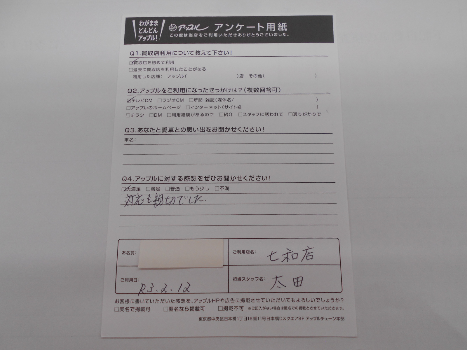 お車のご相談・ 査定だけでもOK! カンタン 入力 30秒 アップルがブランド買取始めました! お電話でも受付中! 受付時間10:00 ~ 19:00 0594-33-2200 お車のご相談・ 査定だけでもOK! カンタン 入力 30秒 アップルがブランド買取始めました! お電話でも受付中! 受付時間10:00 ~ 19:00 0594-33-2200 アップルがブランド買取始めました! お電話でも受付中! 受付時間10:00 ~ 19:00 0594-33-2200 店舗情報 在庫車 スタッフ紹介 ブログ お客様の声 キャンペーン 無料査定 click お客様の声 ご記入日: 2021/02/12 匿名希望様 対応も親切でした。 前へ 次へ お客様の声一覧を見る