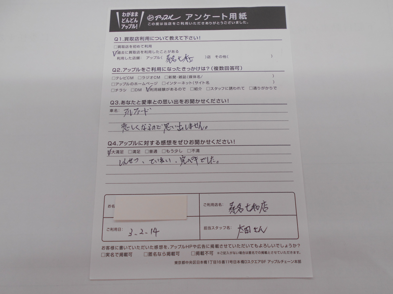 お車のご相談・ 査定だけでもOK! カンタン 入力 30秒 アップルがブランド買取始めました! お電話でも受付中! 受付時間10:00 ~ 19:00 0594-33-2200 お車のご相談・ 査定だけでもOK! カンタン 入力 30秒 アップルがブランド買取始めました! お電話でも受付中! 受付時間10:00 ~ 19:00 0594-33-2200 アップルがブランド買取始めました! お電話でも受付中! 受付時間10:00 ~ 19:00 0594-33-2200 店舗情報 在庫車 スタッフ紹介 ブログ お客様の声 キャンペーン 無料査定 click お客様の声 ご記入日: 2021/02/14 匿名希望アルファード様 しんせつ、ていねい、完ぺきでした。 前へ 次へ お客様の声一覧を見る