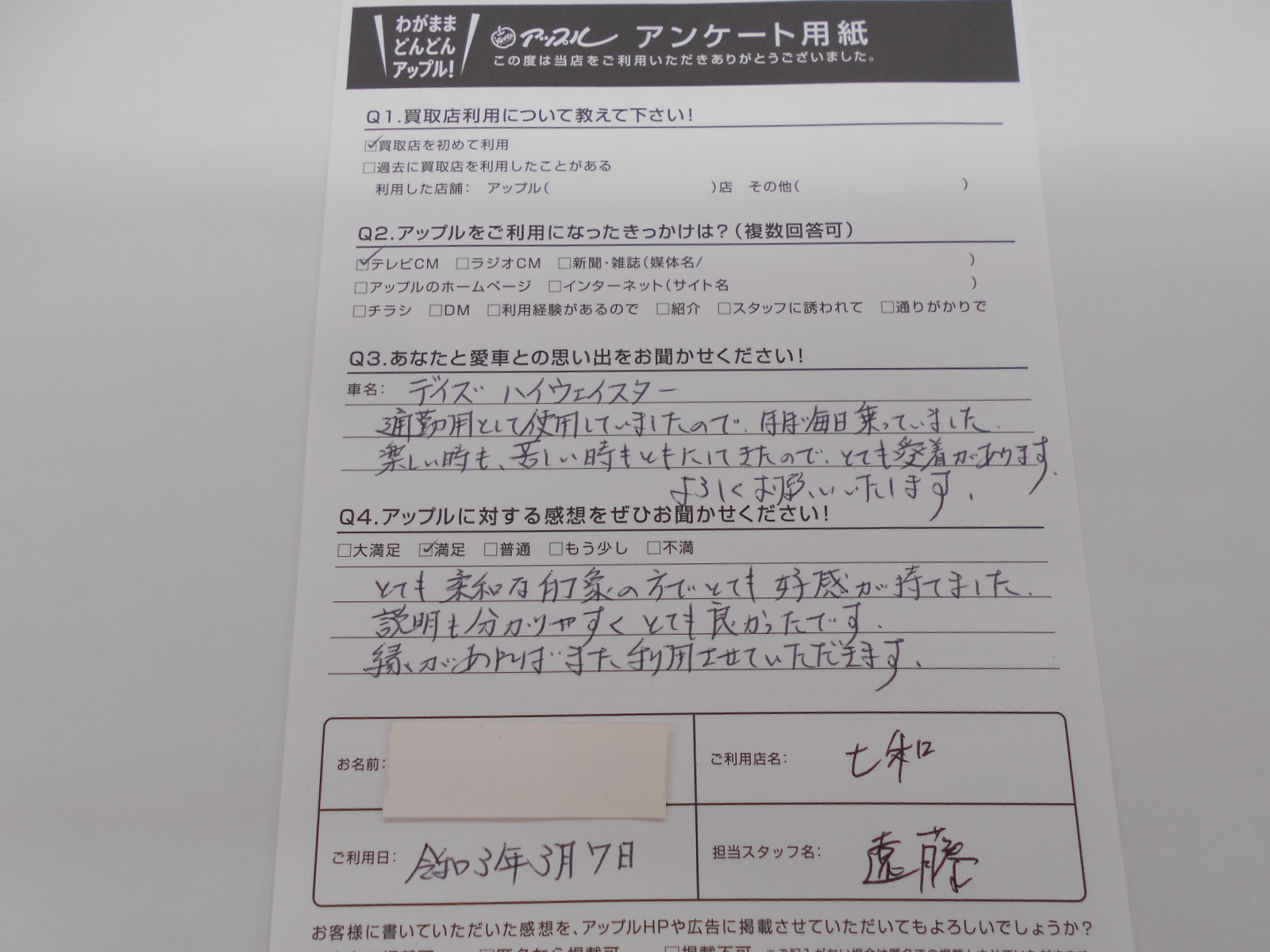 お車のご相談・ 査定だけでもOK! カンタン 入力 30秒 アップルがブランド買取始めました! お電話でも受付中! 受付時間10:00 ~ 19:00 0594-33-2200 お車のご相談・ 査定だけでもOK! カンタン 入力 30秒 アップルがブランド買取始めました! お電話でも受付中! 受付時間10:00 ~ 19:00 0594-33-2200 アップルがブランド買取始めました! お電話でも受付中! 受付時間10:00 ~ 19:00 0594-33-2200 店舗情報 在庫車 スタッフ紹介 ブログ お客様の声 キャンペーン 無料査定 click お客様の声 ご記入日: 2021/03/07 匿名希望デイズ様 とても柔和な印象の方でとても好感が持てました。説明も分かりやすくとても良かったです。縁があればまた利用させていただきます。 前へ 次へ お客様の声一覧を見る
