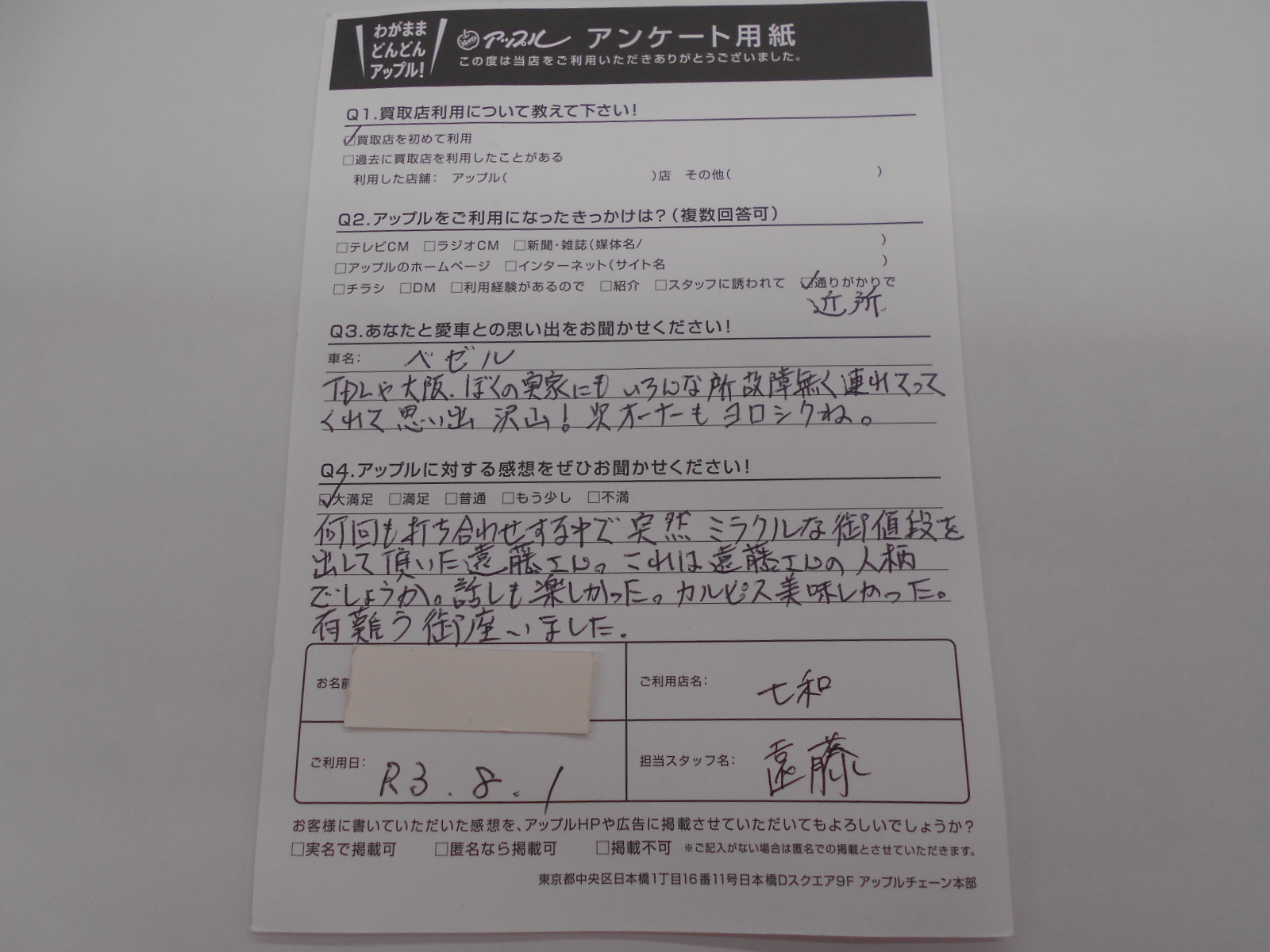 お車のご相談・ 査定だけでもOK! カンタン 入力 30秒 アップルがブランド買取始めました! お電話でも受付中! 受付時間10:00 ~ 19:00 0594-33-2200 お車のご相談・ 査定だけでもOK! カンタン 入力 30秒 アップルがブランド買取始めました! お電話でも受付中! 受付時間10:00 ~ 19:00 0594-33-2200 アップルがブランド買取始めました! お電話でも受付中! 受付時間10:00 ~ 19:00 0594-33-2200 店舗情報 在庫車 スタッフ紹介 ブログ お客様の声 キャンペーン 無料査定 click お客様の声 ご記入日: 2021/08/01 匿名希望ヴェゼル様 何回も打ち合わせする中で突然ミラクルな御値段を出して頂いた遠藤さん。これは遠藤さんの人柄でしょうか。話しも楽しかった。カルピス美味しかった。有難う御座いました。 前へ 次へ お客様の声一覧を見る