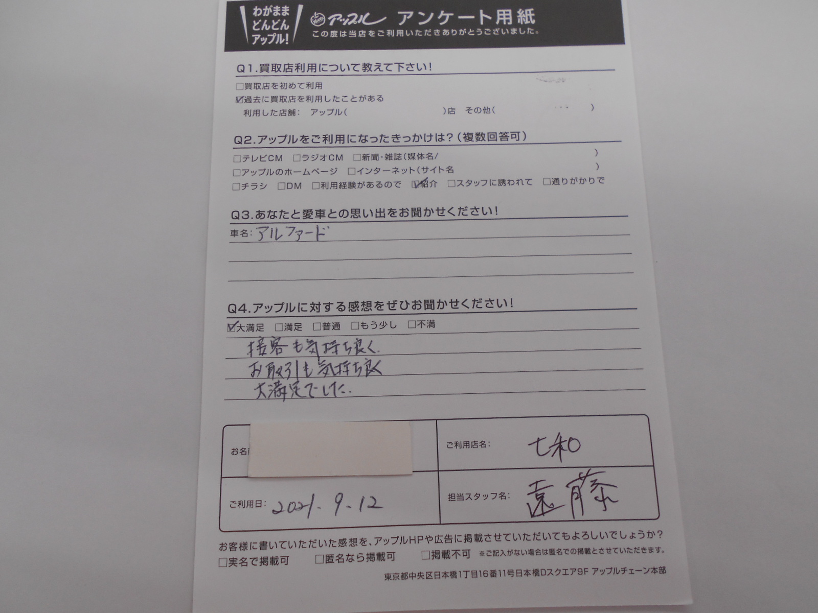 お車のご相談・ 査定だけでもOK! カンタン 入力 30秒 アップルがブランド買取始めました! お電話でも受付中! 受付時間10:00 ~ 19:00 0594-33-2200 お車のご相談・ 査定だけでもOK! カンタン 入力 30秒 アップルがブランド買取始めました! お電話でも受付中! 受付時間10:00 ~ 19:00 0594-33-2200 アップルがブランド買取始めました! お電話でも受付中! 受付時間10:00 ~ 19:00 0594-33-2200 店舗情報 在庫車 スタッフ紹介 ブログ お客様の声 キャンペーン 無料査定 click お客様の声 ご記入日: 2021/09/12 匿名希望アルファード様 接客も気持ち良くお取引も気持ち良く大満足でした。 前へ 次へ お客様の声一覧を見る