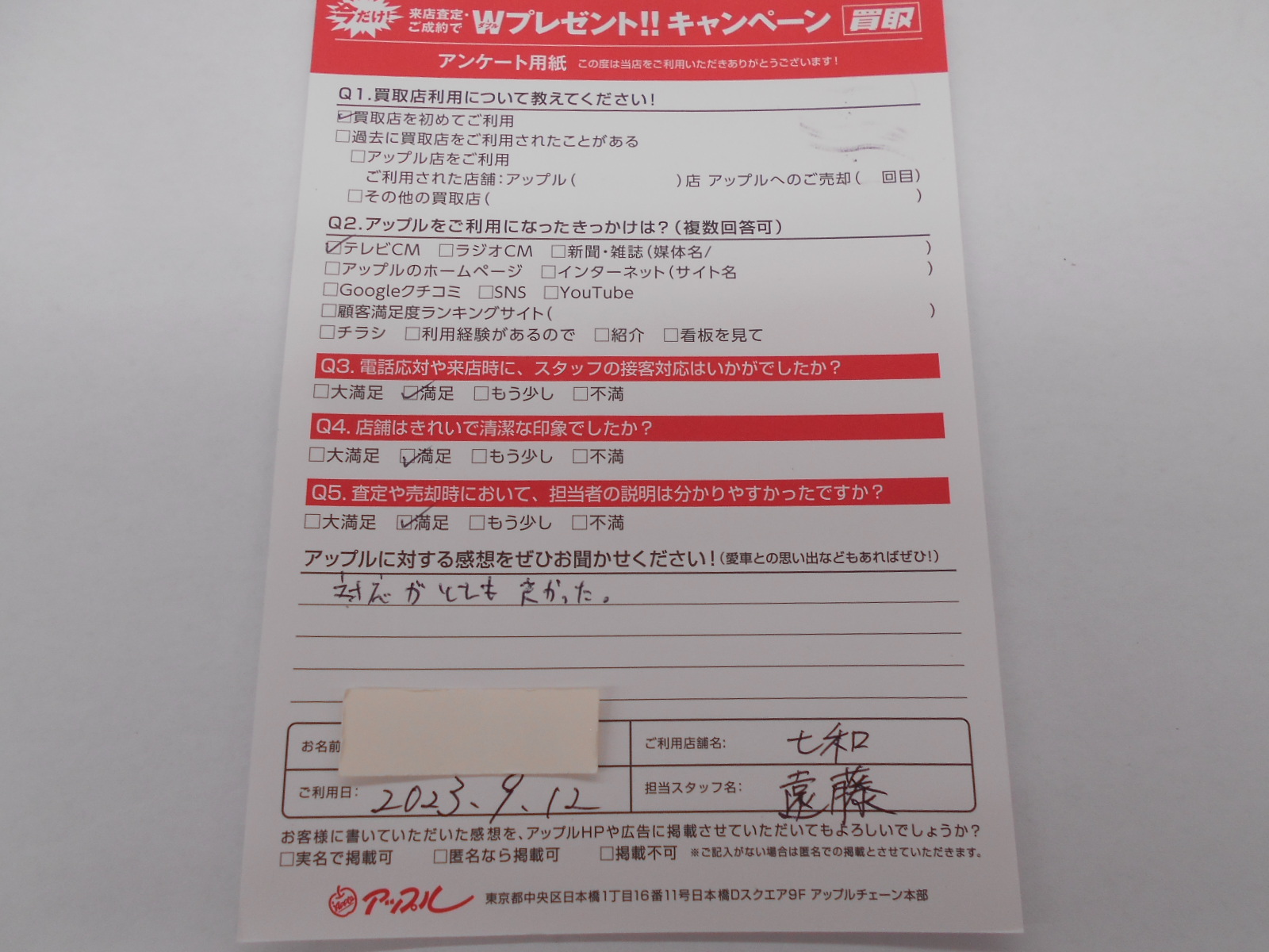 お車のご相談・ 査定だけでもOK! カンタン 入力 30秒 アップルがブランド買取始めました! お電話でも受付中! 受付時間10:00 ~ 19:00 0594-33-2200 お車のご相談・ 査定だけでもOK! カンタン 入力 30秒 アップルがブランド買取始めました! お電話でも受付中! 受付時間10:00 ~ 19:00 0594-33-2200 アップルがブランド買取始めました! お電話でも受付中! 受付時間10:00 ~ 19:00 0594-33-2200 店舗情報 在庫車 スタッフ紹介 ブログ お客様の声 キャンペーン 無料査定 click お客様の声 ご記入日: 2023/09/12 匿名様 車名:三菱 eKワゴン 対応がとても良かった。 前へ 次へ お客様の声一覧を見る