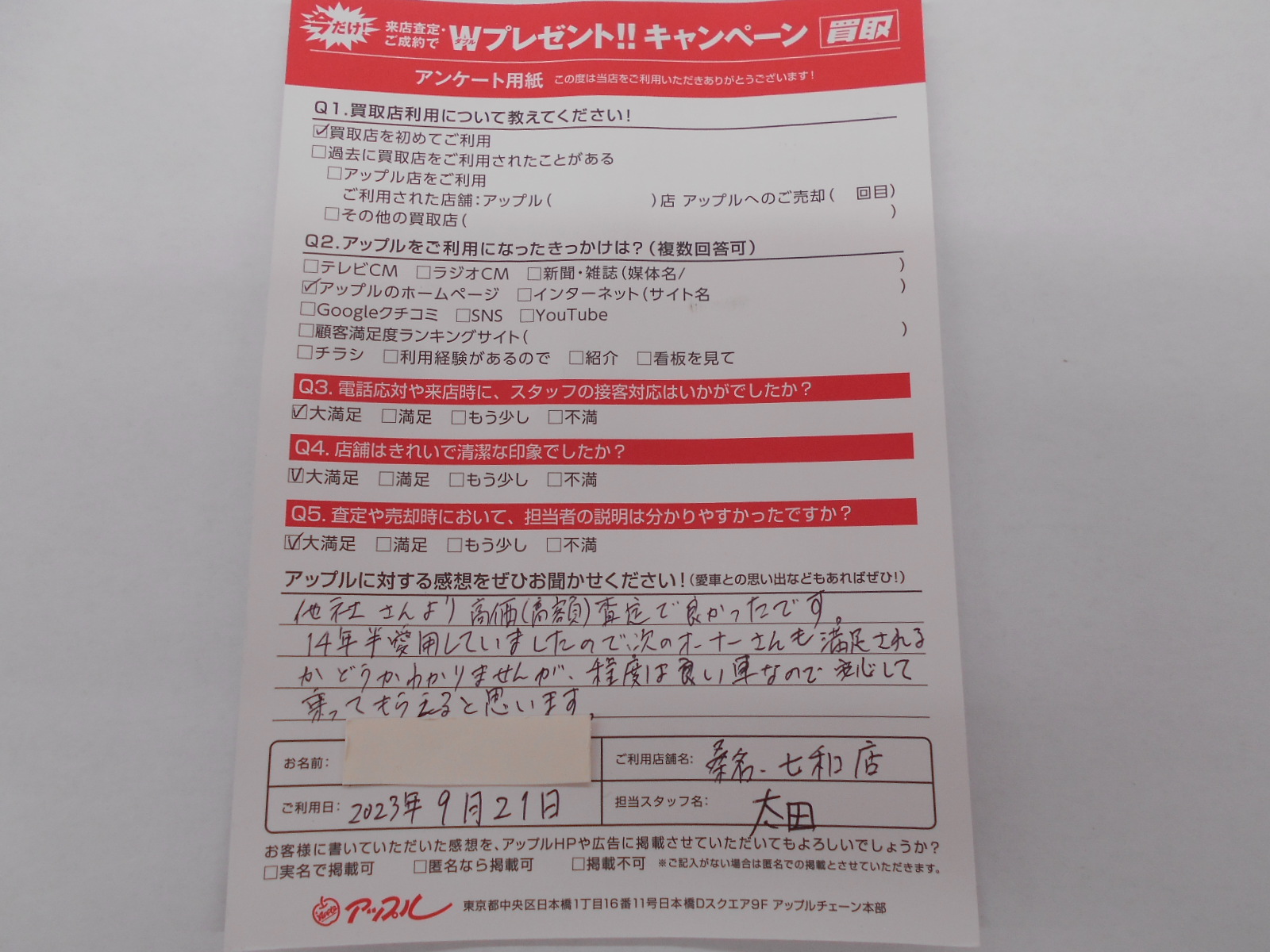 お車のご相談・ 査定だけでもOK! カンタン 入力 30秒 アップルがブランド買取始めました! お電話でも受付中! 受付時間10:00 ~ 19:00 0594-33-2200 お車のご相談・ 査定だけでもOK! カンタン 入力 30秒 アップルがブランド買取始めました! お電話でも受付中! 受付時間10:00 ~ 19:00 0594-33-2200 アップルがブランド買取始めました! お電話でも受付中! 受付時間10:00 ~ 19:00 0594-33-2200 店舗情報 在庫車 スタッフ紹介 ブログ お客様の声 キャンペーン 無料査定 click お客様の声 ご記入日: 2023/09/21 匿名様 車名:スズキ ワゴンR 他社さんより高価(高額)査定で良かったです。14年半愛用していましたので次のオーナーさんも満足されるかどうかわかりませんが、程度は良い車なので安心して乗ってもらえると思います。 前へ 次へ お客様の声一覧を見る