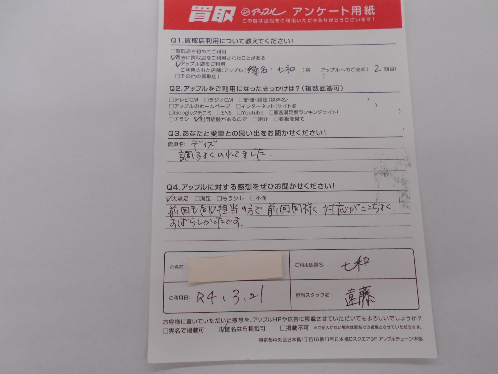 お車のご相談・ 査定だけでもOK! カンタン 入力 30秒 アップルがブランド買取始めました! お電話でも受付中! 受付時間10:00 ~ 19:00 0594-33-2200 お車のご相談・ 査定だけでもOK! カンタン 入力 30秒 アップルがブランド買取始めました! お電話でも受付中! 受付時間10:00 ~ 19:00 0594-33-2200 アップルがブランド買取始めました! お電話でも受付中! 受付時間10:00 ~ 19:00 0594-33-2200 店舗情報 在庫車 スタッフ紹介 ブログ お客様の声 キャンペーン 無料査定 click お客様の声 ご記入日: 2022/03/21 匿名様 車名:日産 デイズ 前回も同じ担当の方で前回同様対応がここちよくすばらしかったです。 前へ 次へ お客様の声一覧を見る