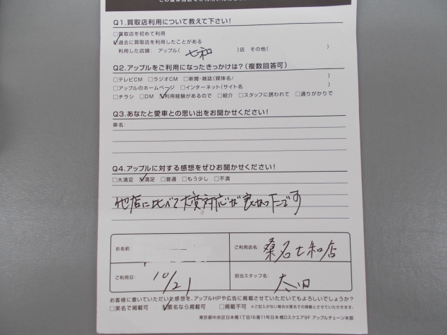 お車のご相談・ 査定だけでもOK! カンタン 入力 30秒 アップルがブランド買取始めました! お電話でも受付中! 受付時間10:00 ~ 19:00 0594-33-2200 お車のご相談・ 査定だけでもOK! カンタン 入力 30秒 アップルがブランド買取始めました! お電話でも受付中! 受付時間10:00 ~ 19:00 0594-33-2200 アップルがブランド買取始めました! お電話でも受付中! 受付時間10:00 ~ 19:00 0594-33-2200 店舗情報 在庫車 スタッフ紹介 ブログ お客様の声 キャンペーン 無料査定 click お客様の声 ご記入日: 2017/10/21 匿名希望 ハリアー様 他店に比べて大変対応が良かったです。 前へ 次へ お客様の声一覧を見る