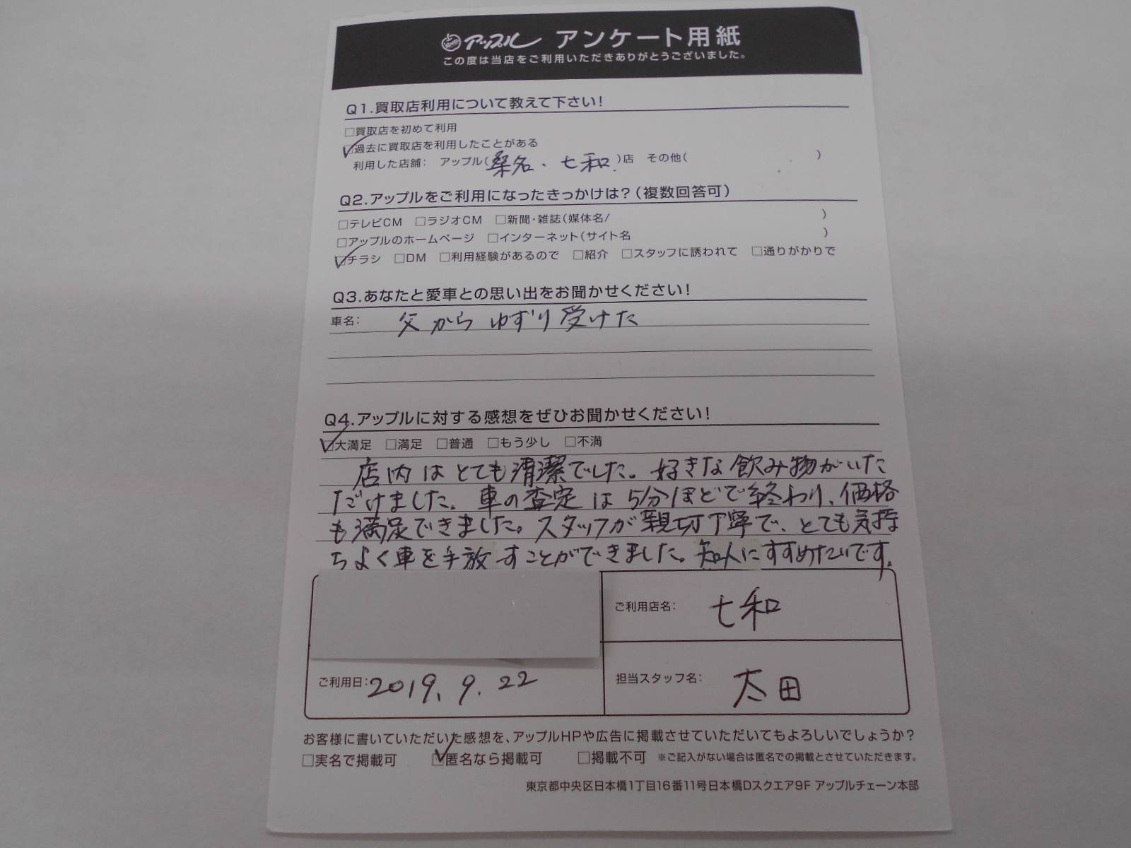 お車のご相談・ 査定だけでもOK! カンタン 入力 30秒 アップルがブランド買取始めました! お電話でも受付中! 受付時間10:00 ~ 19:00 0594-33-2200 お車のご相談・ 査定だけでもOK! カンタン 入力 30秒 アップルがブランド買取始めました! お電話でも受付中! 受付時間10:00 ~ 19:00 0594-33-2200 アップルがブランド買取始めました! お電話でも受付中! 受付時間10:00 ~ 19:00 0594-33-2200 店舗情報 在庫車 スタッフ紹介 ブログ お客様の声 キャンペーン 無料査定 click お客様の声 ご記入日: 2019/09/22 匿名希望様 店内はとても清潔でした。好きな飲み物が頂けました。車の査定は5分ほどで終わり、価格も満足できました。スタッフが新設丁寧で、とれも気持ちよく車を手放す事ができました。知人にもすすめたいです。 前へ 次へ お客様の声一覧を見る