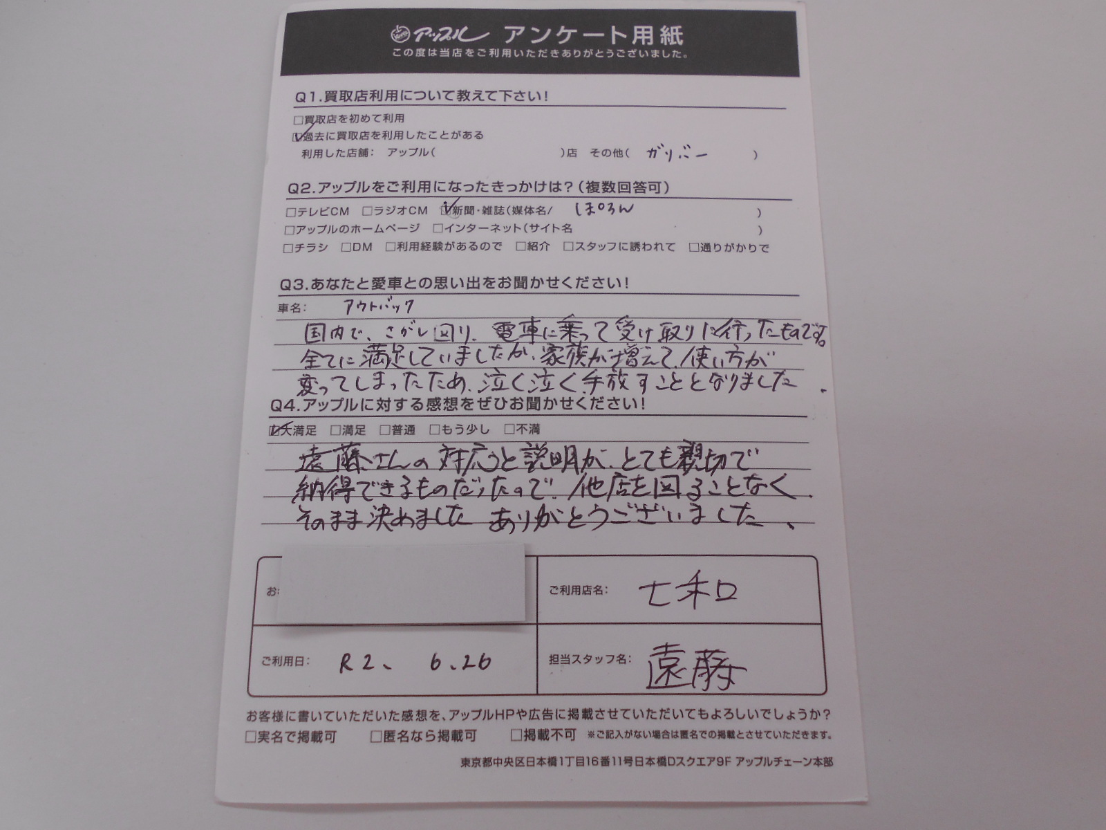 お車のご相談・ 査定だけでもOK! カンタン 入力 30秒 アップルがブランド買取始めました! お電話でも受付中! 受付時間10:00 ~ 19:00 0594-33-2200 お車のご相談・ 査定だけでもOK! カンタン 入力 30秒 アップルがブランド買取始めました! お電話でも受付中! 受付時間10:00 ~ 19:00 0594-33-2200 アップルがブランド買取始めました! お電話でも受付中! 受付時間10:00 ~ 19:00 0594-33-2200 店舗情報 在庫車 スタッフ紹介 ブログ お客様の声 キャンペーン 無料査定 click お客様の声 ご記入日: 2020/06/26 匿名希望アウトバック様 車名:スバル レガシィアウトバック(H15年10月~) アウトバック(H15年10月~) 遠藤さんの対応と説明がとても親切で納得できるものだったので、他店を回ることなくそのまま決めました。ありがとうございました。 前へ 次へ お客様の声一覧を見る