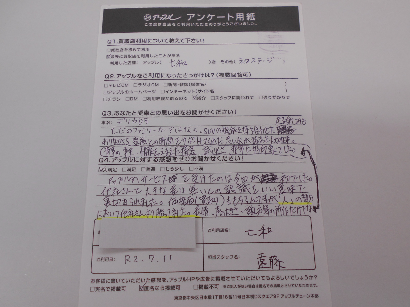 アップルさんのサービスを受けたのは今回が初でした。他社さんと大きな差は無いとの認識をいい意味で裏切られました。価格面(買取り)ももちろんですが「人」の部分において他社さんより勝ってました。表情、声の大きさ、話し方等お所作だけではなく背景の事実、情報をふまえた接客、誠実さ非常に好印象でした。
