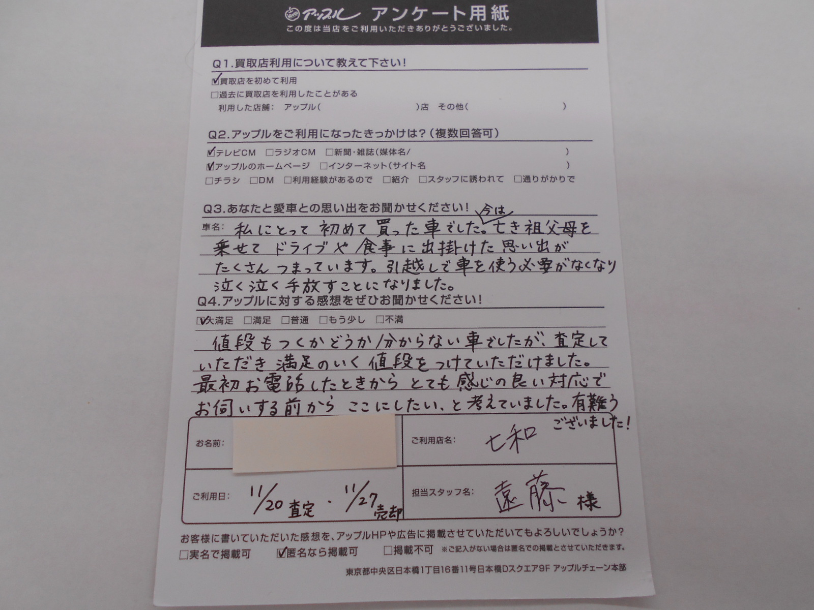 値段もつくかどうか分からない車でしたが、査定していただき満足のいく値段をつけていただけました。最初お電話した時からとても感じの良い対応でお伺いする前からここにしたい、と考えてました。有難うございました!