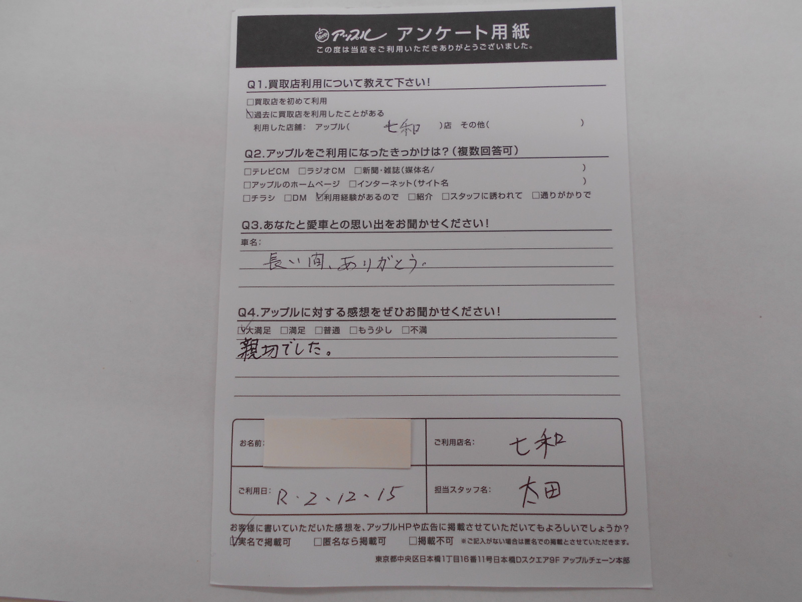 お車のご相談・ 査定だけでもOK! カンタン 入力 30秒 アップルがブランド買取始めました! お電話でも受付中! 受付時間10:00 ~ 19:00 0594-33-2200 お車のご相談・ 査定だけでもOK! カンタン 入力 30秒 アップルがブランド買取始めました! お電話でも受付中! 受付時間10:00 ~ 19:00 0594-33-2200 アップルがブランド買取始めました! お電話でも受付中! 受付時間10:00 ~ 19:00 0594-33-2200 店舗情報 在庫車 スタッフ紹介 ブログ お客様の声 キャンペーン 無料査定 click お客様の声 ご記入日: 2020/12/15 佐藤明男様 親切でした。 前へ 次へ お客様の声一覧を見る