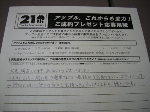 お車のご相談・ 査定だけでもOK! カンタン 入力 30秒 アップルがブランド買取始めました! お電話でも受付中! 受付時間10:00 ~19:00 042-788-4511 お車のご相談・ 査定だけでもOK! カンタン 入力 30秒 アップルがブランド買取始めました! お電話でも受付中! 受付時間10:00 ~19:00 042-788-4511 アップルがブランド買取始めました! お電話でも受付中! 受付時間10:00 ~19:00 042-788-4511 店舗情報 在庫車 スタッフ紹介 ブログ お客様の声 キャンペーン お得 無料査定 click お客様の声 ご記入日: 2010/03/01 Y,I様 大変満足してます。ありがとうございました。7年間 ずっと一緒に走った愛車なので、最後には写真も取りました。スタッフの心遣いや親切とともに、第二の方にも気持ちよく走ってもらえたら嬉しいです。 前へ 次へ お客様の声一覧を見る