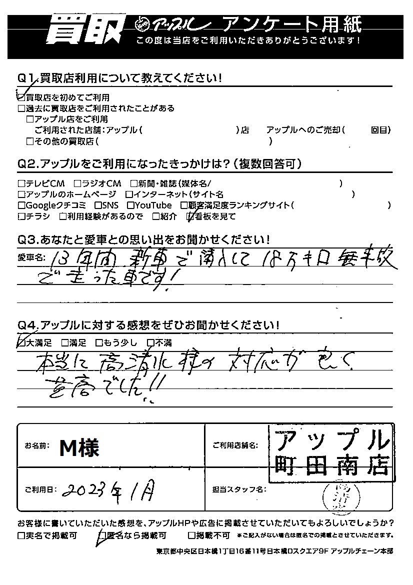 お車のご相談・ 査定だけでもOK! カンタン 入力 30秒 アップルがブランド買取始めました! お電話でも受付中! 受付時間10:00 ~19:00 042-788-4511 お車のご相談・ 査定だけでもOK! カンタン 入力 30秒 アップルがブランド買取始めました! お電話でも受付中! 受付時間10:00 ~19:00 042-788-4511 アップルがブランド買取始めました! お電話でも受付中! 受付時間10:00 ~19:00 042-788-4511 店舗情報 在庫車 スタッフ紹介 ブログ お客様の声 キャンペーン お得 無料査定 click お客様の声 ご記入日: 2023/08/03 M様 ご利用日:2023年1月 担当:高清水Q.あなたと愛車との思い出をお聞かせください!13年間新車で購入して18万キロ無事故で走った車です!Q.アップルに対する感想をぜひお聞かせください!大満足本当に高清水様の対応力が良く、最高でした!! 前へ 次へ お客様の声一覧を見る