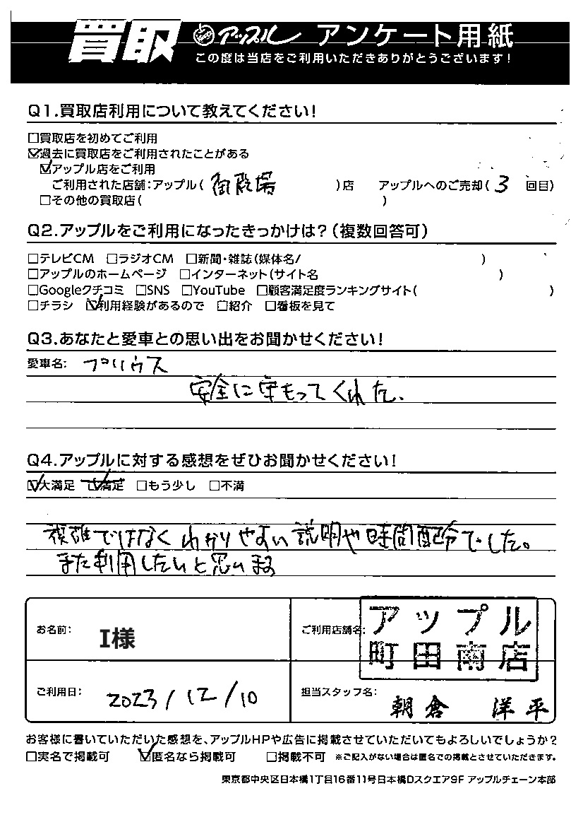 お車のご相談・ 査定だけでもOK! カンタン 入力 30秒 アップルがブランド買取始めました! お電話でも受付中! 受付時間10:00 ~19:00 042-788-4511 お車のご相談・ 査定だけでもOK! カンタン 入力 30秒 アップルがブランド買取始めました! お電話でも受付中! 受付時間10:00 ~19:00 042-788-4511 アップルがブランド買取始めました! お電話でも受付中! 受付時間10:00 ~19:00 042-788-4511 店舗情報 在庫車 スタッフ紹介 ブログ お客様の声 キャンペーン お得 無料査定 click お客様の声 ご記入日: 2024/02/19 I様 車名:トヨタ プリウス(2023年3月~のPHVを含む) ご利用日:2023年12月10日 担当:朝倉洋平あなたと愛車との思い出をお聞かせください!安全に守ってくれた。アップルに対する感想をぜひお聞かせください!複雑ではなくわかりやすい説明や時間配分でした。また利用したいと思います。 前へ 次へ お客様の声一覧を見る