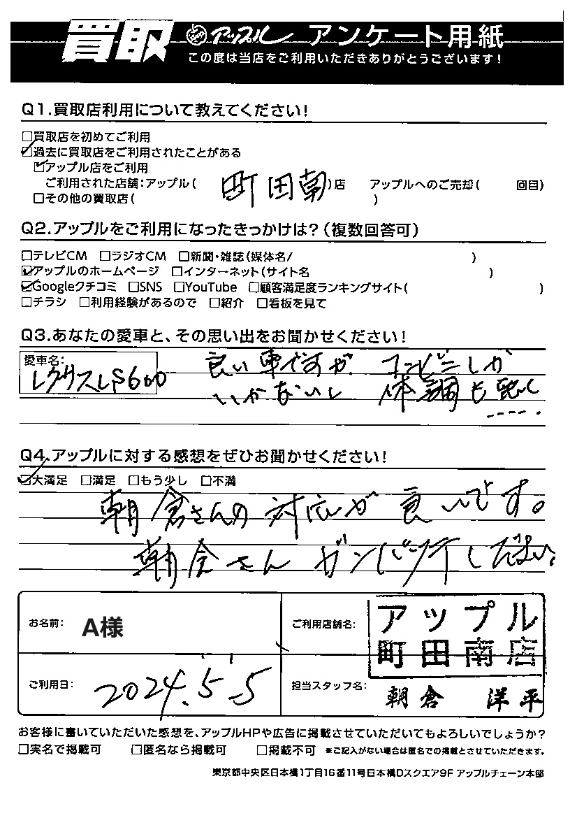 お車のご相談・ 査定だけでもOK! カンタン 入力 30秒 アップルがブランド買取始めました! お電話でも受付中! 受付時間10:00 ~19:00 042-788-4511 お車のご相談・ 査定だけでもOK! カンタン 入力 30秒 アップルがブランド買取始めました! お電話でも受付中! 受付時間10:00 ~19:00 042-788-4511 アップルがブランド買取始めました! お電話でも受付中! 受付時間10:00 ~19:00 042-788-4511 店舗情報 在庫車 スタッフ紹介 ブログ お客様の声 キャンペーン お得 無料査定 click お客様の声 ご記入日: 2024/07/12 A様 車名:レクサス ご利用日:2024年5月5日 担当:朝倉洋平あなたの愛車と、その思い出をお聞かせください!愛車名:レクサスLS600 良い車輌ですが、コンビニしかいかないし 体調も悪く.....アップルに対する感想をぜひお聞かせください!朝倉さんの対応が良いです。朝倉さんガンバッテください。 前へ 次へ お客様の声一覧を見る