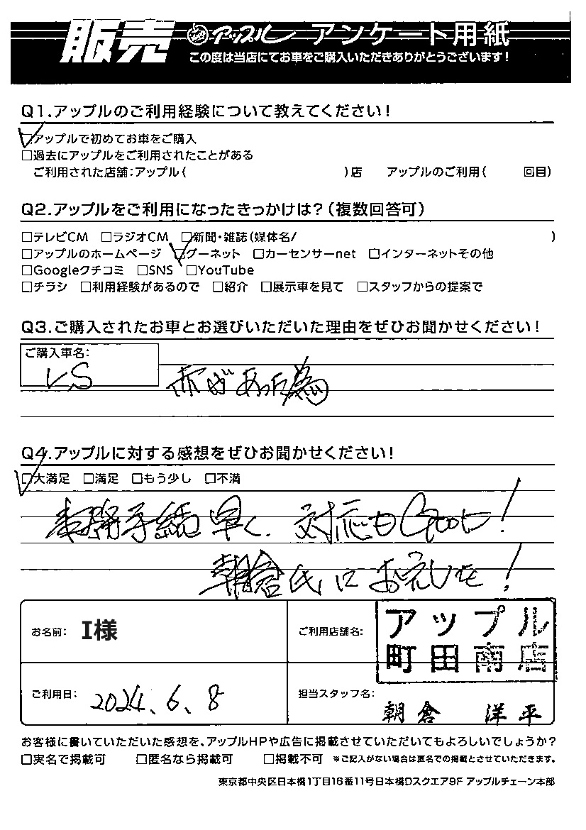 お車のご相談・ 査定だけでもOK! カンタン 入力 30秒 アップルがブランド買取始めました! お電話でも受付中! 受付時間10:00 ~19:00 042-788-4511 お車のご相談・ 査定だけでもOK! カンタン 入力 30秒 アップルがブランド買取始めました! お電話でも受付中! 受付時間10:00 ~19:00 042-788-4511 アップルがブランド買取始めました! お電話でも受付中! 受付時間10:00 ~19:00 042-788-4511 店舗情報 在庫車 スタッフ紹介 ブログ お客様の声 キャンペーン お得 無料査定 click お客様の声 ご記入日: 2024/07/18 I様 車名:レクサス ご利用日:2024年6月8日 担当:朝倉洋平アップルに対する感想をぜひお聞かせください!事務手続早く、対応もGood!朝倉氏にお礼を! 前へ 次へ お客様の声一覧を見る