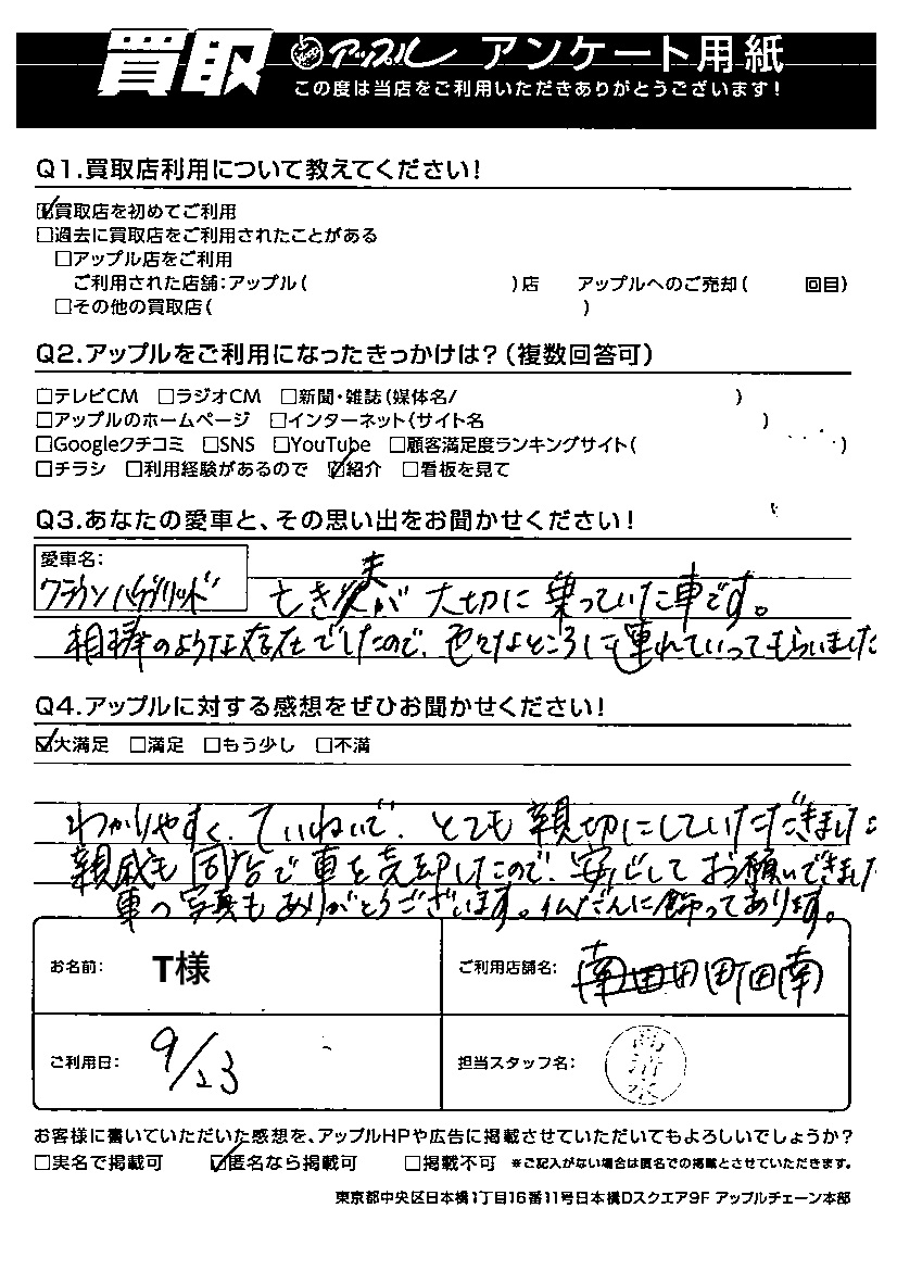 わかりやすくていねいで、とても親切にしていただきました。親戚も同店で車を売却したので、