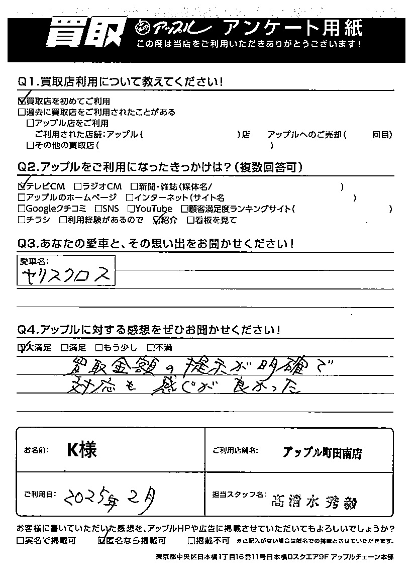 お車のご相談・ 査定だけでもOK! カンタン 入力 30秒 アップルがブランド買取始めました! お電話でも受付中! 受付時間10:00 ~19:00 042-788-4511 お車のご相談・ 査定だけでもOK! カンタン 入力 30秒 アップルがブランド買取始めました! お電話でも受付中! 受付時間10:00 ~19:00 042-788-4511 アップルがブランド買取始めました! お電話でも受付中! 受付時間10:00 ~19:00 042-788-4511 店舗情報 在庫車 スタッフ紹介 ブログ お客様の声 キャンペーン お得 無料査定 click お客様の声 ご記入日: -/-/- K様 車名:トヨタ ヤリスクロス ご利用日:2025/02 K 様 ご愛車 ヤリスクロス 担当:高清水Q.買取店利用について教えてください!A.買取店を初めてご利用Q.アップルをご利用になったきっかけは?A.テレビCM 紹介Q.アップルに対する感想をぜひお聞かせください!A.大満足 買取金額の提示が明確で、対応も感じが良かった。 前へ 次へ お客様の声一覧を見る