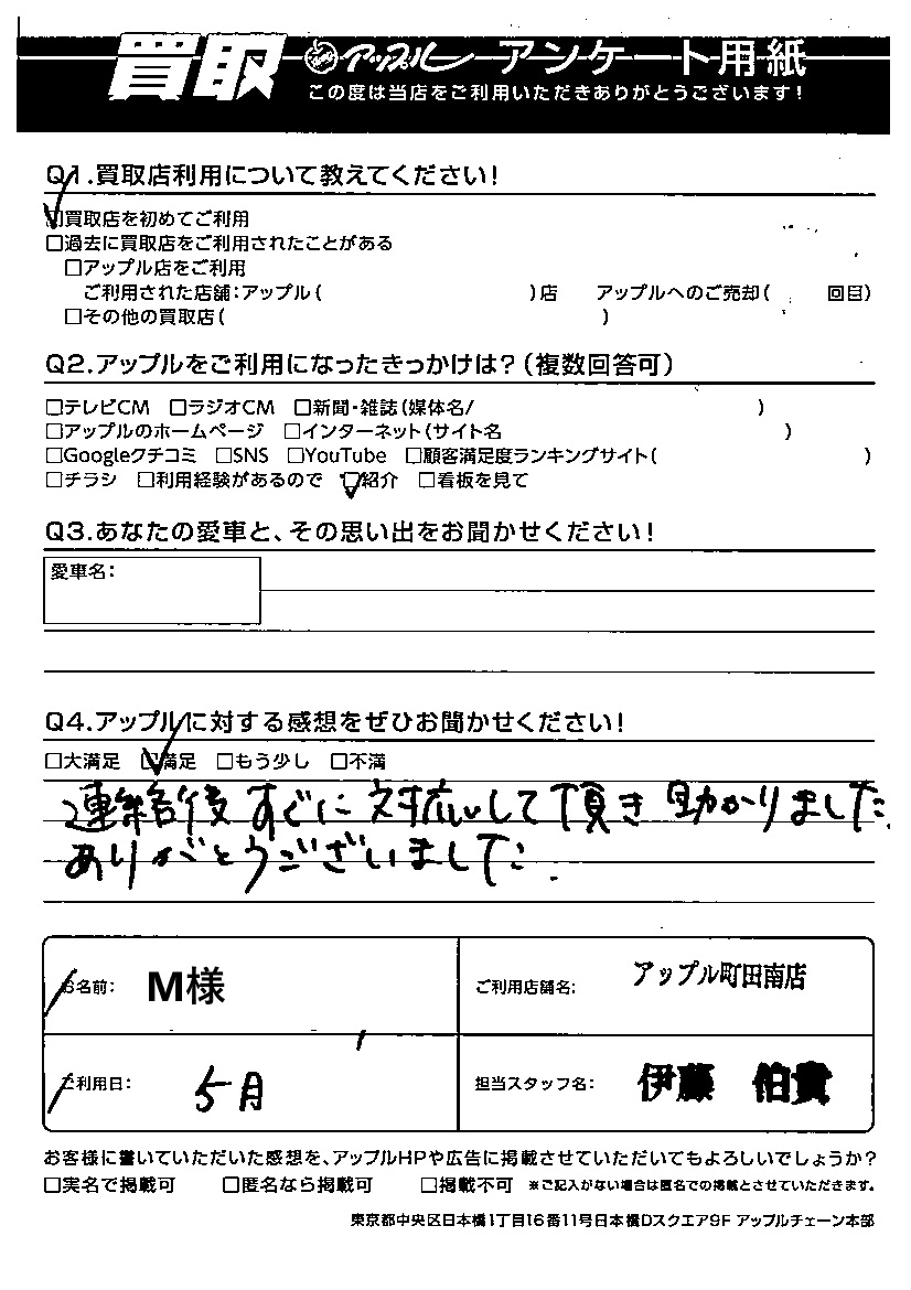 お車のご相談・ 査定だけでもOK! カンタン 入力 30秒 アップルがブランド買取始めました! お電話でも受付中! 受付時間10:00 ~19:00 042-788-4511 お車のご相談・ 査定だけでもOK! カンタン 入力 30秒 アップルがブランド買取始めました! お電話でも受付中! 受付時間10:00 ~19:00 042-788-4511 アップルがブランド買取始めました! お電話でも受付中! 受付時間10:00 ~19:00 042-788-4511 店舗情報 在庫車 スタッフ紹介 ブログ お客様の声 キャンペーン お得 無料査定 click お客様の声 ご記入日: -/-/- M様 ご利用日:2025/05 M 様 担当:伊藤Q.買取店利用について教えてください!A.買取店を初めてご利用Q.アップルをご利用になったきっかけは?A.紹介Q.アップルに対する感想をぜひお聞かせください!A.満足 連絡後すぐに対応して頂き助かりました。ありがとうございました。 前へ 次へ お客様の声一覧を見る