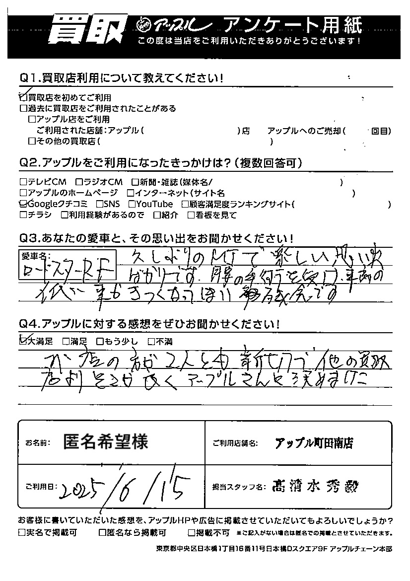 匿名希望様 車名:マツダ ロードスターRF
