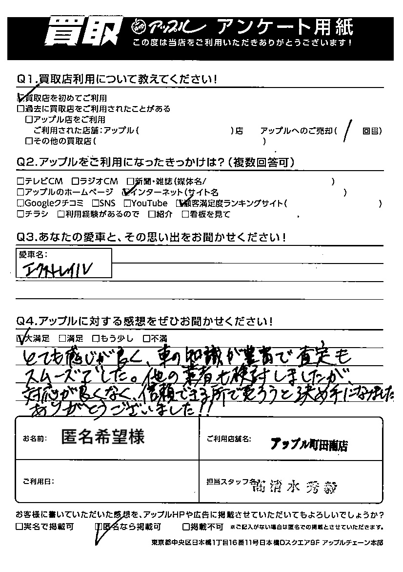とても感じが良く、車の知識が豊富で査定もスムーズでした。他の業者も検討しましたが、対応が良くなく、信頼