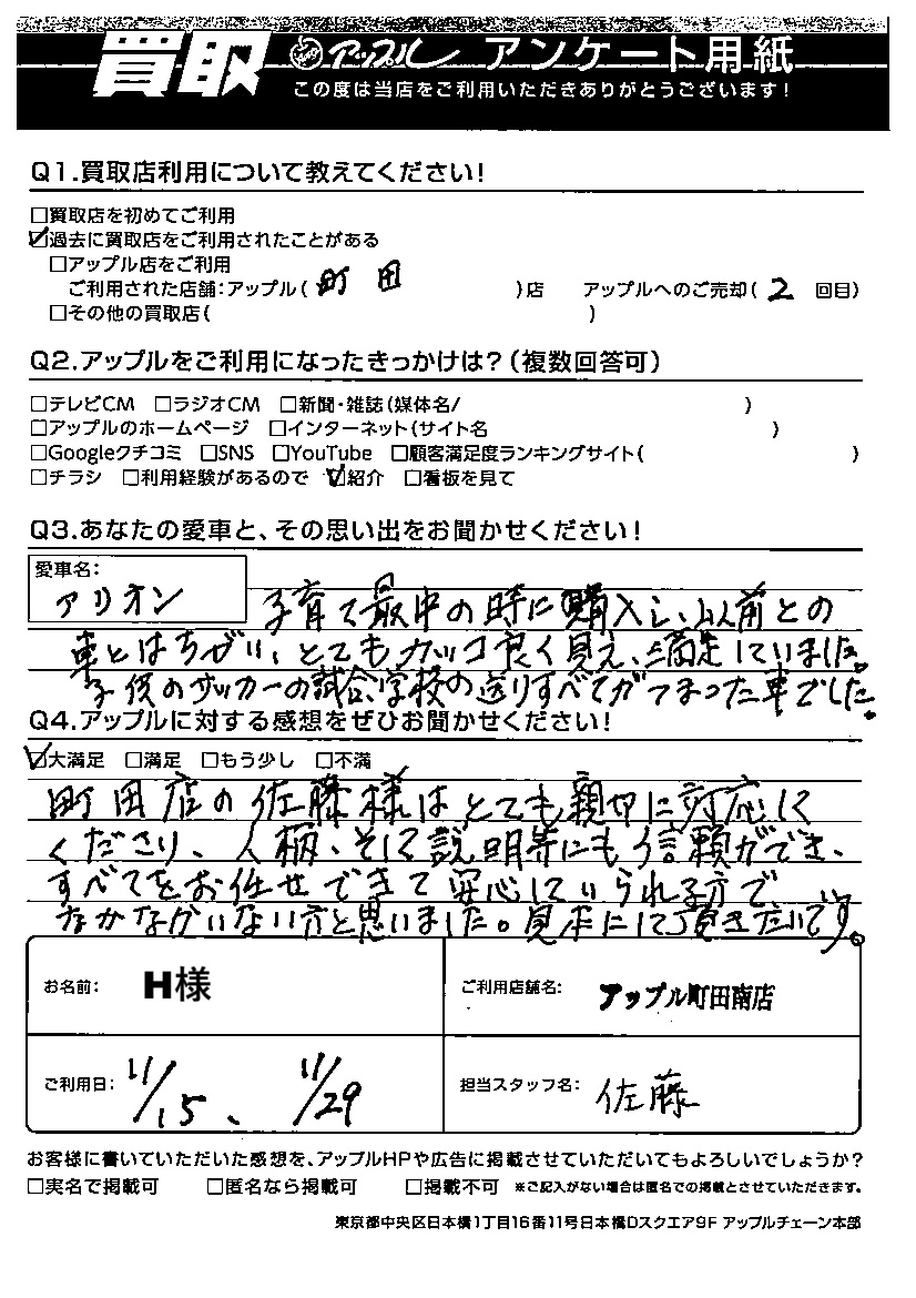 A.大満足 町田店の佐藤様はとても親切に対応してくださり、人柄そして説明等にも信頼ができ、すべてをお任せでき