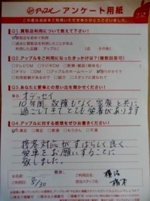 お車のご相談・ 査定だけでもOK! カンタン 入力 30秒 アップルがブランド買取始めました! お電話でも受付中! 受付時間9:30 ~ 18:30 045-430-5123 お車のご相談・ 査定だけでもOK! カンタン 入力 30秒 アップルがブランド買取始めました! お電話でも受付中! 受付時間9:30 ~ 18:30 045-430-5123 アップルがブランド買取始めました! お電話でも受付中! 受付時間9:30 ~ 18:30 045-430-5123 店舗情報 在庫車 スタッフ紹介 ブログ お客様の声 キャンペーン 無料査定 click お客様の声 ご記入日: 2014/08/10 H様 ■ご利用日時■ H26年5月30日■車種■オデッセイ■担当者■ 橋本【アップルに対する感想をぜひお書きください】満足度★★★★★接客対応がすばらしく良く、愛車をお願いすることに致しました。 前へ 次へ お客様の声一覧を見る