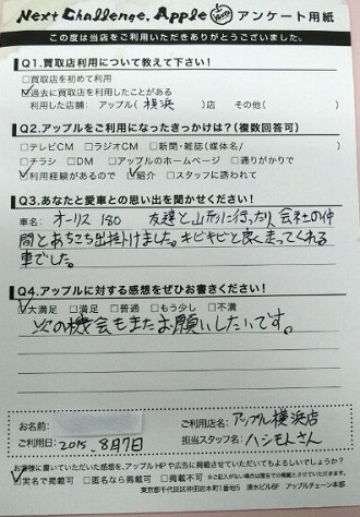 お車のご相談・ 査定だけでもOK! カンタン 入力 30秒 アップルがブランド買取始めました! お電話でも受付中! 受付時間9:30 ~ 18:30 045-430-5123 お車のご相談・ 査定だけでもOK! カンタン 入力 30秒 アップルがブランド買取始めました! お電話でも受付中! 受付時間9:30 ~ 18:30 045-430-5123 アップルがブランド買取始めました! お電話でも受付中! 受付時間9:30 ~ 18:30 045-430-5123 店舗情報 在庫車 スタッフ紹介 ブログ お客様の声 キャンペーン 無料査定 click お客様の声 ご記入日: 2015/08/07 N・Y様 ■ご利用日時■ H27年8月7日■車種■ オーリス■担当者■ 橋本【アップルに対する感想をぜひお書きください】満足度★★★★★次の機会もまたお願いしたいです。 前へ 次へ お客様の声一覧を見る