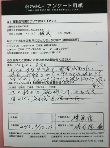 お車のご相談・ 査定だけでもOK! カンタン 入力 30秒 アップルがブランド買取始めました! お電話でも受付中! 受付時間9:30 ~ 18:30 045-430-5123 お車のご相談・ 査定だけでもOK! カンタン 入力 30秒 アップルがブランド買取始めました! お電話でも受付中! 受付時間9:30 ~ 18:30 045-430-5123 アップルがブランド買取始めました! お電話でも受付中! 受付時間9:30 ~ 18:30 045-430-5123 店舗情報 在庫車 スタッフ紹介 ブログ お客様の声 キャンペーン 無料査定 click お客様の声 ご記入日: 2016/06/18 I・Y様 ■ご利用日時■ H28年06月18日■車種■ ボルボS40■担当者■ 橋本【アップルに対する感想をぜひお書きください】満足度★★★★★丁寧に説明していただきました対応も良かった。 前へ 次へ お客様の声一覧を見る