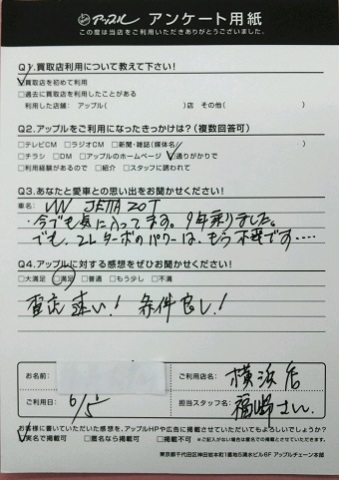 お車のご相談・ 査定だけでもOK! カンタン 入力 30秒 アップルがブランド買取始めました! お電話でも受付中! 受付時間9:30 ~ 18:30 045-430-5123 お車のご相談・ 査定だけでもOK! カンタン 入力 30秒 アップルがブランド買取始めました! お電話でも受付中! 受付時間9:30 ~ 18:30 045-430-5123 アップルがブランド買取始めました! お電話でも受付中! 受付時間9:30 ~ 18:30 045-430-5123 店舗情報 在庫車 スタッフ紹介 ブログ お客様の声 キャンペーン 無料査定 click お客様の声 ご記入日: 2016/06/05 F様 ■ご利用日時■ H28年06月05日■車種■ VWジェッタ■担当者■ 福嶋【アップルに対する感想をぜひお書きください】満足度★★★★★査定速い・・・条件よし! 前へ 次へ お客様の声一覧を見る
