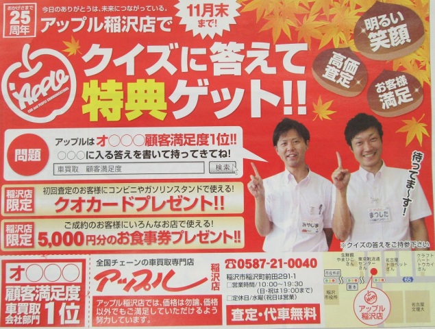 お車のご相談・ 査定だけでもOK! カンタン 入力 30秒 アップルがブランド買取始めました! お電話でも受付中! 受付時間10:00 ~ 19:00 0587-21-0040 お車のご相談・ 査定だけでもOK! カンタン 入力 30秒 アップルがブランド買取始めました! お電話でも受付中! 受付時間10:00 ~ 19:00 0587-21-0040 アップルがブランド買取始めました! お電話でも受付中! 受付時間10:00 ~ 19:00 0587-21-0040 店舗情報 在庫車 スタッフ紹介 ブログ お客様の声 キャンペーン 無料査定 click 最新記事一覧 月別アーカイブ 2026年04月(3)2026年03月(2)2026年02月(1)2026年01月(4)2025年12月(4)2025年11月(6)2025年10月(4)2025年09月(7)2025年08月(8)2025年07月(8)2025年06月(2)2025年05月(5)2025年04月(6)2025年03月(3)2025年02月(1)2025年01月(7)2024年12月(2)2024年11月(4)2024年10月(2)2024年09月(4)2024年08月(4)2024年07月(6)2024年06月(1)2024年05月(4)2024年04月(5)2024年03月(5)2024年02月(2)2024年01月(5)2023年12月(4)2023年11月(4)2023年10月(4)2023年09月(6)2023年08月(6)2023年07月(9)2023年06月(7)2023年05月(4)2023年04月(8)2023年03月(4)2023年02月(3)2023年01月(6)2022年12月(11)2022年11月(8)2022年10月(9)2022年09月(11)2022年08月(9)2022年07月(14)2022年06月(13)2022年05月(6)2022年04月(8)2022年03月(8)2022年02月(9)2022年01月(12)2021年12月(12)2021年11月(11)2021年10月(9)2021年09月(10)2021年08月(14)2021年07月(15)2021年06月(16)2021年05月(11)2021年04月(8)2021年03月(7)2021年02月(8)2021年01月(9)2020年12月(8)2020年11月(7)2020年10月(14)2020年09月(15)2020年08月(17)2020年07月(15)2020年06月(16)2020年05月(13)2020年04月(15)2020年03月(13)2020年02月(17)2020年01月(14)2019年12月(17)2019年11月(13)2019年10月(7)2019年09月(8)2019年08月(10)2019年07月(9)2019年06月(12)2019年05月(16)2019年04月(6)2019年03月(6)2019年02月(12)2019年01月(3)2018年12月(8)2018年11月(8)2018年10月(19)2018年09月(25)2018年08月(22)2018年07月(27)2018年06月(24)2018年05月(16)2018年04月(16)2018年03月(9)2018年02月(5)2018年01月(10)2017年12月(8)2017年11月(5)2017年10月(10)2017年09月(4)2017年08月(7)2017年07月(10)2017年06月(9)2017年05月(10)2017年04月(8)2017年03月(4)2017年02月(7)2017年01月(10)2016年12月(13)2016年11月(8)2016年10月(6)2016年09月(6)2016年08月(5)2016年07月(12)2016年06月(3)2016年05月(5)2016年04月(3)2016年03月(1)2016年02月(1)2016年01月(2)2015年12月(2)2015年11月(3)2015年10月(2)2015年09月(4)2015年08月(4)2015年07月(4)2015年06月(4)2015年05月(4)2015年04月(4)2015年03月(2)2015年02月(4)2015年01月(4)2014年12月(5)2014年11月(9)2014年10月(4)2014年09月(8)2014年08月(12)2014年07月(8)2014年06月(8)2014年05月(7)2014年04月(5)2014年02月(3)2014年01月(3)2013年12月(1)2013年11月(2)2013年09月(1) 1111-1120/1174件中 [ 未分類 ] 2014/11/08(土) 12:20 いなッピーと走ろう どうも~(^◇^)ゆで卵はマヨネーズ派、松下です。11/8良い歯の日、皆様いかがお過ごしですか?歯磨いてますか?僕はご飯を食べた後に磨こうと思います(^◇^)さて先日、稲沢市役所に行ったところ、こんなものを発見しました!!いなッピーナンバープレート!!!!かーわーいーいー(*‘&… [ 未分類 ] 2014/11/06(木) 14:55 わたし、気になります! こんにちは!アップル稲沢店アドバイザー、明るく楽しい松下さんです(`ー´)ノ11月に突入し、すっかり秋!と思いきや、今日は暑いくらいですねー。季節の変わり目…乾燥…体調崩しやすい季節!そんな時は、美味しいものを食べましょう(`・ω・&acu… [ 未分類 ] 2014/10/28(火) 14:50 クイズに答えて特典 ゲッツ!! こんにちは!!今日はよく晴れてますね!お久しぶりです!賞味期限を気にしない男松下です(`ー´)ノさて先日、近隣の皆様のお手元に届きましたよね!フリーペーパーDOMS(ドムス)さん!!どーんこんな感じです!クイズに答えて特典ゲッツ!アンドターン!アンドリバース!という事で、〇〇〇に… [ 未分類 ] 2014/10/17(金) 14:27 咲き誇れ花たち! こんにちは!毎度おなじみまつしたです。一気に冷え込んだ…と思いきや日中は動くと暑さを感じますね。皆様も体調管理にお気を付け下さい(`・ω・´)わたくし松下はジムに通って健康増進キャンペーン中です!!!さて本日は~お久しぶりのアップル稲沢菜園!どうなってい… [ 未分類 ] 2014/10/11(土) 18:13 キャンペーン尽くし。 こんにちは!アップル稲沢店のブログを書いてる方、松下です(`ー´)ノ足が遠のいていたジムにも昨日久しぶりに行ってまいりました。皆さん、やっぱりスポーツの秋ですよ(^◇^)通い詰めて理想の肉体を手に入れるぞ~。さて大人気(?)の松下最近ハマっているものシリーズ。今日はコチラ!!「ミ… [ 未分類 ] 2014/10/04(土) 17:17 アップル稲沢ラーメン紀行 こんにちは!ラーメン大好き松下さんです。お寿司も大好きです。特にえんがわが好きです(・∀・)でも今日はラーメンです!先日、宮嶋店長と地域密着の一環として(?)行ってきました。なんとアップル稲沢店から徒歩2分ほど。「マルシンラーメン」さん。ドドドド豚骨!!!!濃厚なスープにカタめ… [ 未分類 ] 2014/09/29(月) 16:40 くまもん(^◇^) みなさんこんにちわ!!アドバイザーのプーさん安井です^^今日は日差しがとても強いですね(;∀;)風も強いのでお出掛けされる方お気を付けください(`・ω・´)さて今回ご紹介するのはくまモン!!知らない方はいないとは思いますが一応参考画像を...熊です