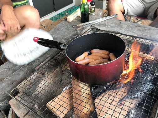金網の上で鍋を使ってウィンナーを焼くスタイル・・・(;^ω^)