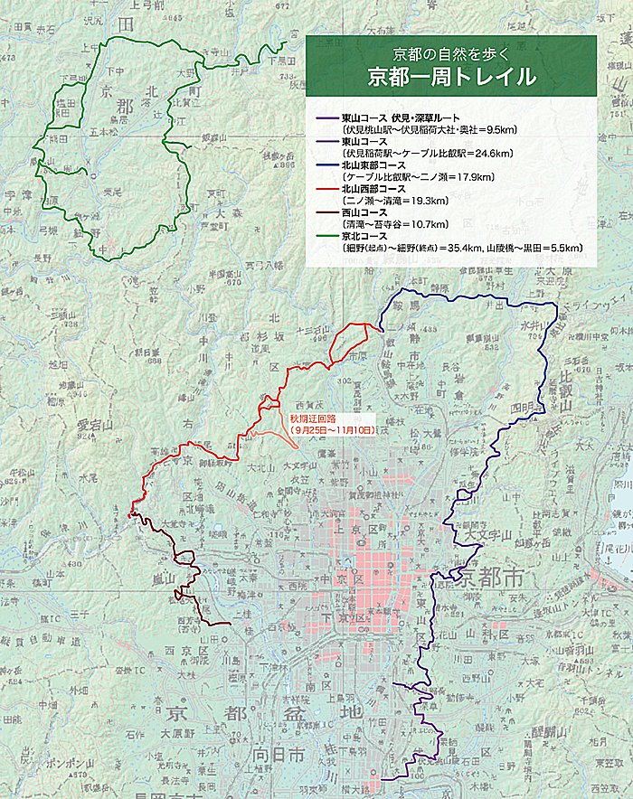 さらに、西賀茂から高雄・清滝を経て嵐山・苔寺に至るもので、歴史や文化も一緒に楽しめる京都ならではのトレイルです。