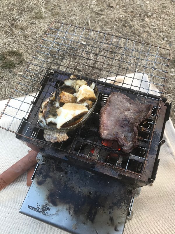 風が強かったですが炭火でアワビと牛タンを焼き(^_-)-☆