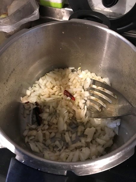みじん切りした玉ねぎとしょうが・ニンニクをバターで炒めます~