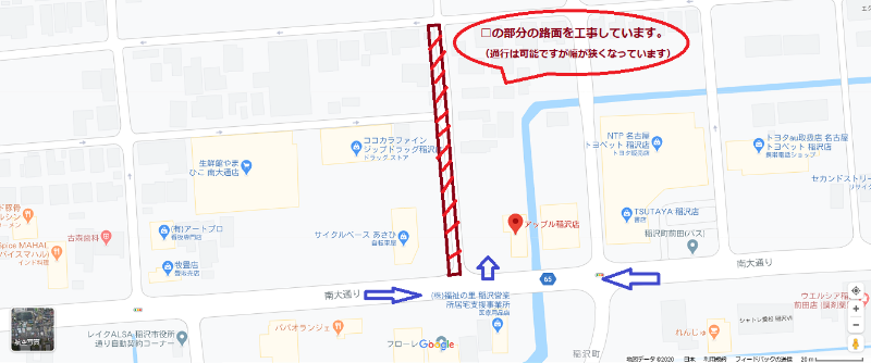 お車のご相談・ 査定だけでもOK! カンタン 入力 30秒 アップルがブランド買取始めました! お電話でも受付中! 受付時間10:00 ~ 19:00 0587-21-0040 お車のご相談・ 査定だけでもOK! カンタン 入力 30秒 アップルがブランド買取始めました! お電話でも受付中! 受付時間10:00 ~ 19:00 0587-21-0040 アップルがブランド買取始めました! お電話でも受付中! 受付時間10:00 ~ 19:00 0587-21-0040 店舗情報 在庫車 スタッフ紹介 ブログ お客様の声 キャンペーン 無料査定 click [ 未分類 ] 2020/07/28 (火) 10:07 店舗西側の道路で工事が行われています! みなさまこんにちは!!アップル稲沢店です!タイトルにもある通りですが、本日、店舗西側の道路の路面工事が行われています。(厳密には配管工事のようです)ご覧のように重機を使っているので、その分路幅が狭くなっています。(奥の通ろうとしているシルバーの車は5ナンバーサイズです)地図上で見るとこのエリアです↓ ↓西側の出入り口もお使いいただけますが、ご来店の際は南大通り(青い矢印のところ)から(こちら南大通り沿いの出入り口をご利用くださいませ)お越しいただけると幸いです。工事は明日も続きますが、明日は当店お休みとなりますので、本日のみご面倒おかけしますが、ご理解の程宜しくお願い致します。以上、アップル稲沢店からのお知らせでした! 2020-07-28 10:07:30 新しい記事へ 古い記事へ 最新記事 ☆入園&入学☆☆独自キャンペーンと臨時休業のお知らせ☆☆岐阜かかみがはら航空宇宙博物館☆ご褒美!★あいち航空ミュージアム★ 店舗情報に戻る 月別アーカイブ 2026年04月(3)2026年03月(2)2026年02月(1)2026年01月(4)2025年12月(4)2025年11月(6)2025年10月(4)2025年09月(7)2025年08月(8)2025年07月(8)2025年06月(2)2025年05月(5)2025年04月(6)2025年03月(3)2025年02月(1)2025年01月(7)2024年12月(2)2024年11月(4)2024年10月(2)2024年09月(4)2024年08月(4)2024年07月(6)2024年06月(1)2024年05月(4)2024年04月(5)2024年03月(5)2024年02月(2)2024年01月(5)2023年12月(4)2023年11月(4)2023年10月(4)2023年09月(6)2023年08月(6)2023年07月(9)2023年06月(7)2023年05月(4)2023年04月(8)2023年03月(4)2023年02月(3)2023年01月(6)2022年12月(11)2022年11月(8)2022年10月(9)2022年09月(11)2022年08月(9)2022年07月(14)2022年06月(13)2022年05月(6)2022年04月(8)2022年03月(8)2022年02月(9)2022年01月(12)2021年12月(12)2021年11月(11)2021年10月(9)2021年09月(10)2021年08月(14)2021年07月(15)2021年06月(16)2021年05月(11)2021年04月(8)2021年03月(7)2021年02月(8)2021年01月(9)2020年12月(8)2020年11月(7)2020年10月(14)2020年09月(15)2020年08月(17)2020年07月(15)2020年06月(16)2020年05月(13)2020年04月(15)2020年03月(13)2020年02月(17)2020年01月(14)2019年12月(17)2019年11月(13)2019年10月(7)2019年09月(8)2019年08月(10)2019年07月(9)2019年06月(12)2019年05月(16)2019年04月(6)2019年03月(6)2019年02月(12)2019年01月(3)2018年12月(8)2018年11月(8)2018年10月(19)2018年09月(25)2018年08月(22)2018年07月(27)2018年06月(24)2018年05月(16)2018年04月(16)2018年03月(9)2018年02月(5)2018年01月(10)2017年12月(8)2017年11月(5)2017年10月(10)2017年09月(4)2017年08月(7)2017年07月(10)2017年06月(9)2017年05月(10)2017年04月(8)2017年03月(4)2017年02月(7)2017年01月(10)2016年12月(13)2016年11月(8)2016年10月(6)2016年09月(6)2016年08月(5)2016年07月(12)2016年06月(3)2016年05月(5)2016年04月(3)2016年03月(1)2016年02月(1)2016年01月(2)2015年12月(2)2015年11月(3)2015年10月(2)2015年09月(4)2015年08月(4)2015年07月(4)2015年06月(4)2015年05月(4)2015年04月(4)2015年03月(2)2015年02月(4)2015年01月(4)2014年12月(5)2014年11月(9)2014年10月(4)2014年09月(8)2014年08月(12)2014年07月(8)2014年06月(8)2014年05月(7)2014年04月(5)2014年02月(3)2014年01月(3)2013年12月(1)2013年11月(2)2013年09月(1)