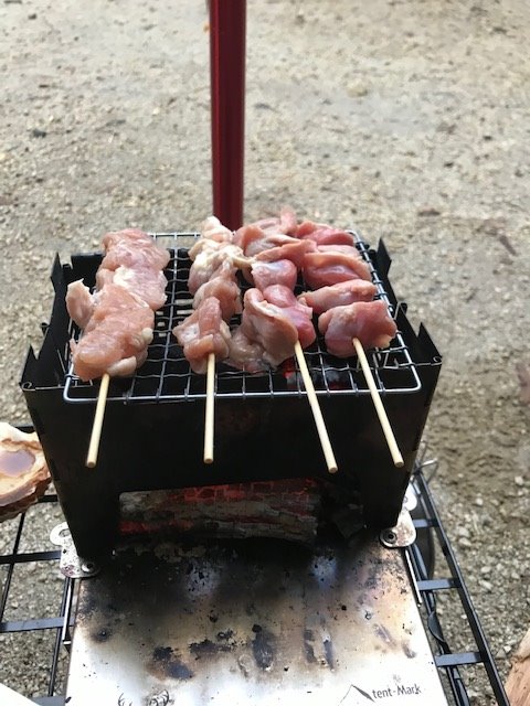 自ら串うちした焼き鳥を炭火で焼いたり