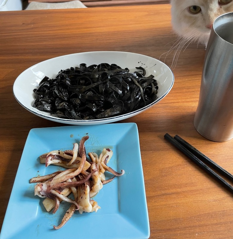 イカ墨パスタとゲソのソテーをつくりましたが美味しかったです☆