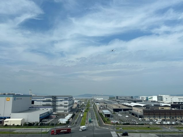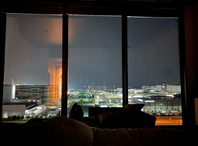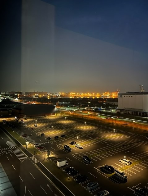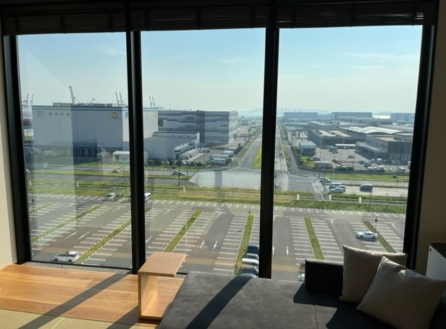 3面の巨大ガラス張りになってまして、工業地帯~博多湾、