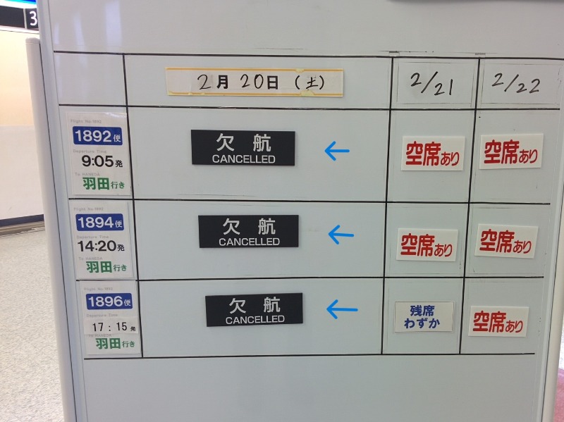 悪天候でその日の全便が欠航になってしまったパターンです( ゚Д゚)