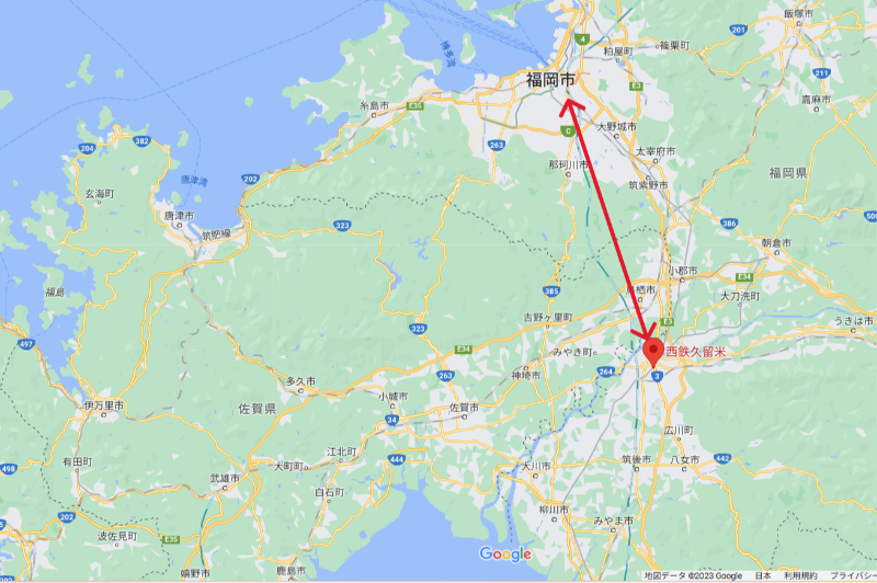 福岡市の天神から西鉄電車で30~40分ほどの場所にあります。