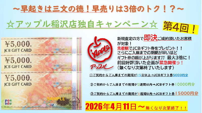 と、ご契約からご入庫が早ければ早いほど大変お得なキャンペーンとなっております!!