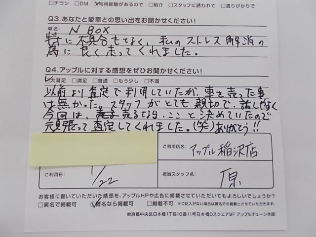 お車のご相談・ 査定だけでもOK! カンタン 入力 30秒 アップルがブランド買取始めました! お電話でも受付中! 受付時間10:00 ~ 19:00 0587-21-0040 お車のご相談・ 査定だけでもOK! カンタン 入力 30秒 アップルがブランド買取始めました! お電話でも受付中! 受付時間10:00 ~ 19:00 0587-21-0040 アップルがブランド買取始めました! お電話でも受付中! 受付時間10:00 ~ 19:00 0587-21-0040 店舗情報 在庫車 スタッフ紹介 ブログ お客様の声 キャンペーン 無料査定 click お客様の声 ご記入日: 2021/01/22 匿名様 車名:ホンダ N-BOX 以前より査定で利用していたが車を売ったことは無かった。スタッフがとても親切で話しやすく今回は売るならここと決めていたので頑張って査定してくれました。(笑)ありがとう! 前へ 次へ お客様の声一覧を見る