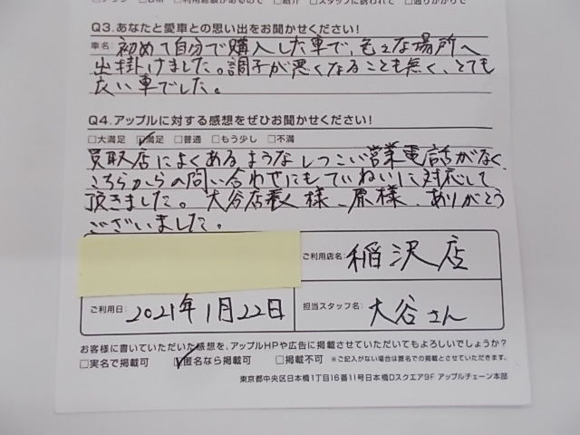お車のご相談・ 査定だけでもOK! カンタン 入力 30秒 アップルがブランド買取始めました! お電話でも受付中! 受付時間10:00 ~ 19:00 0587-21-0040 お車のご相談・ 査定だけでもOK! カンタン 入力 30秒 アップルがブランド買取始めました! お電話でも受付中! 受付時間10:00 ~ 19:00 0587-21-0040 アップルがブランド買取始めました! お電話でも受付中! 受付時間10:00 ~ 19:00 0587-21-0040 店舗情報 在庫車 スタッフ紹介 ブログ お客様の声 キャンペーン 無料査定 click お客様の声 ご記入日: 2021/01/22 匿名様 車名:スバル フォレスター 買取店によくあるようなしつこい営業電話が無くこちらからの問い合わせにもていねいに対応して頂きました。大谷店長様、原様ありがとうございました。 前へ 次へ お客様の声一覧を見る
