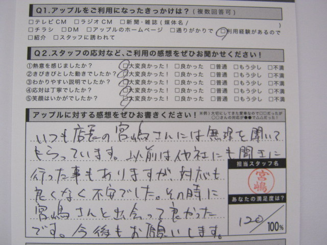 お車のご相談・ 査定だけでもOK! カンタン 入力 30秒 アップルがブランド買取始めました! お電話でも受付中! 受付時間10:00 ~ 19:00 0587-21-0040 お車のご相談・ 査定だけでもOK! カンタン 入力 30秒 アップルがブランド買取始めました! お電話でも受付中! 受付時間10:00 ~ 19:00 0587-21-0040 アップルがブランド買取始めました! お電話でも受付中! 受付時間10:00 ~ 19:00 0587-21-0040 店舗情報 在庫車 スタッフ紹介 ブログ お客様の声 キャンペーン 無料査定 click お客様の声 ご記入日: 2011/09/20 匿名様 いつも店長の宮嶋さんには無理を聞いてもらっています。以前は他社にも聞きに行った事もありますが、対応も良くなく不安でした。その時に宮嶋さんと出会って良かったです。今後もお願いします。 前へ 次へ お客様の声一覧を見る