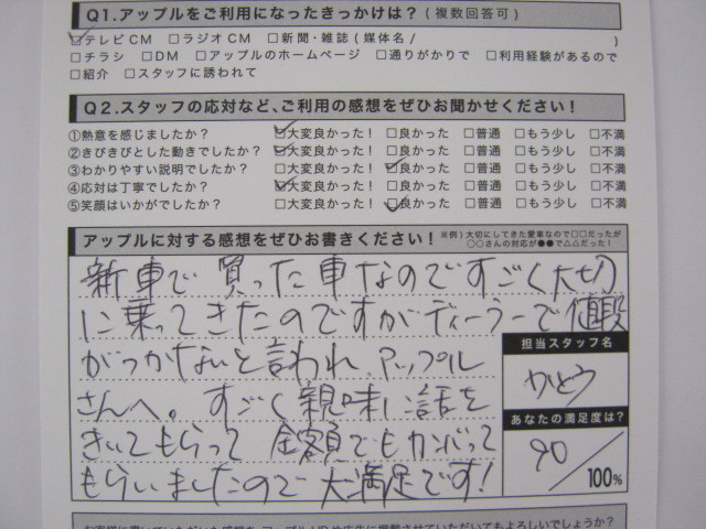お車のご相談・ 査定だけでもOK! カンタン 入力 30秒 アップルがブランド買取始めました! お電話でも受付中! 受付時間10:00 ~ 19:00 0587-21-0040 お車のご相談・ 査定だけでもOK! カンタン 入力 30秒 アップルがブランド買取始めました! お電話でも受付中! 受付時間10:00 ~ 19:00 0587-21-0040 アップルがブランド買取始めました! お電話でも受付中! 受付時間10:00 ~ 19:00 0587-21-0040 店舗情報 在庫車 スタッフ紹介 ブログ お客様の声 キャンペーン 無料査定 click お客様の声 ご記入日: 2011/09/16 K様 新車で買った車なのですごく大切に乗ってきたのですが、ディーラーで値段がつかないと言われ、あっぷるさんへ。すごく親身に話を聞いてもらって金額でもがんばってもらいましたので大満足です! 前へ 次へ お客様の声一覧を見る