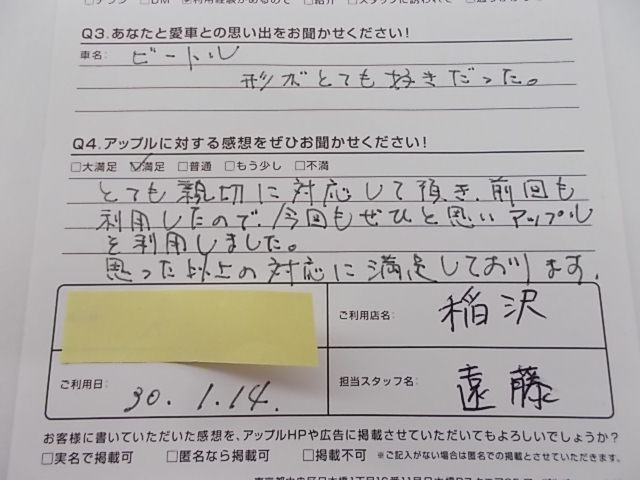 お車のご相談・ 査定だけでもOK! カンタン 入力 30秒 アップルがブランド買取始めました! お電話でも受付中! 受付時間10:00 ~ 19:00 0587-21-0040 お車のご相談・ 査定だけでもOK! カンタン 入力 30秒 アップルがブランド買取始めました! お電話でも受付中! 受付時間10:00 ~ 19:00 0587-21-0040 アップルがブランド買取始めました! お電話でも受付中! 受付時間10:00 ~ 19:00 0587-21-0040 店舗情報 在庫車 スタッフ紹介 ブログ お客様の声 キャンペーン 無料査定 click お客様の声 ご記入日: 2018/01/14 匿名様 とても親切に対応して頂き、前回も利用したので、今回もぜひと思いアップルを利用しました。思った以上の対応に満足しております。 前へ 次へ お客様の声一覧を見る